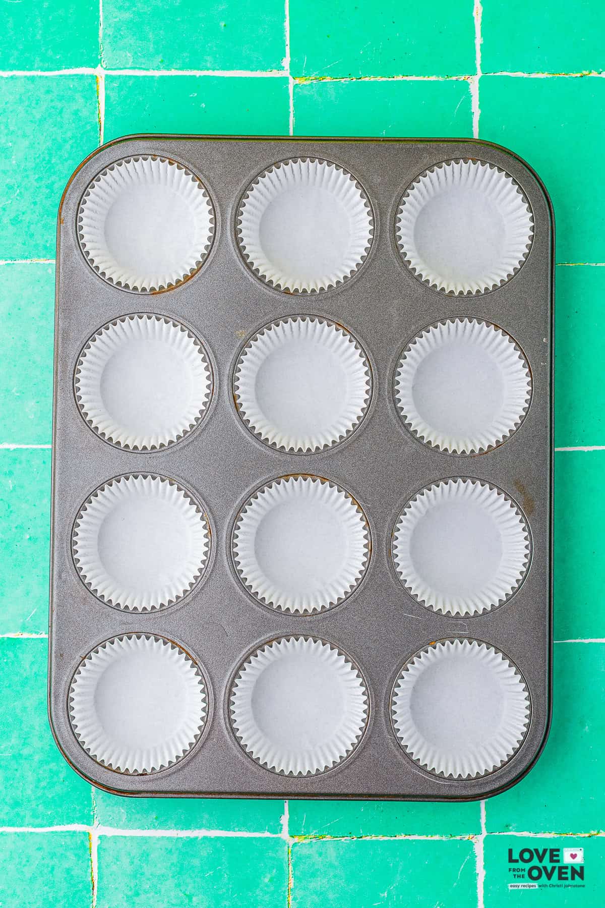 - Prepare a muffin pan with 12 muffin liners.