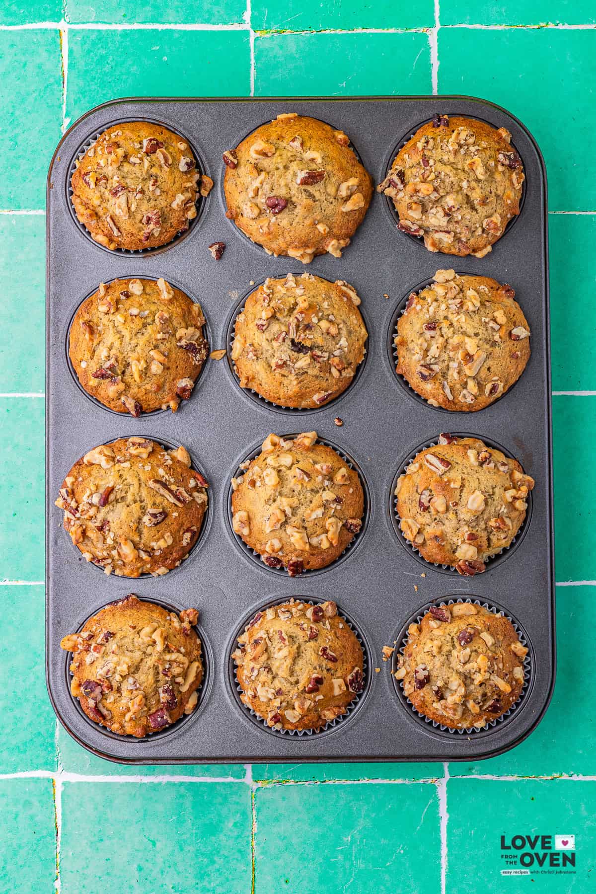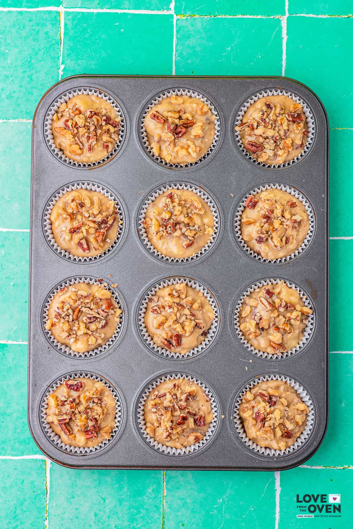 Step 4: Scoop batter into prepared muffin pan and bake. If desired you can top your muffins with extra nuts prior to baking.