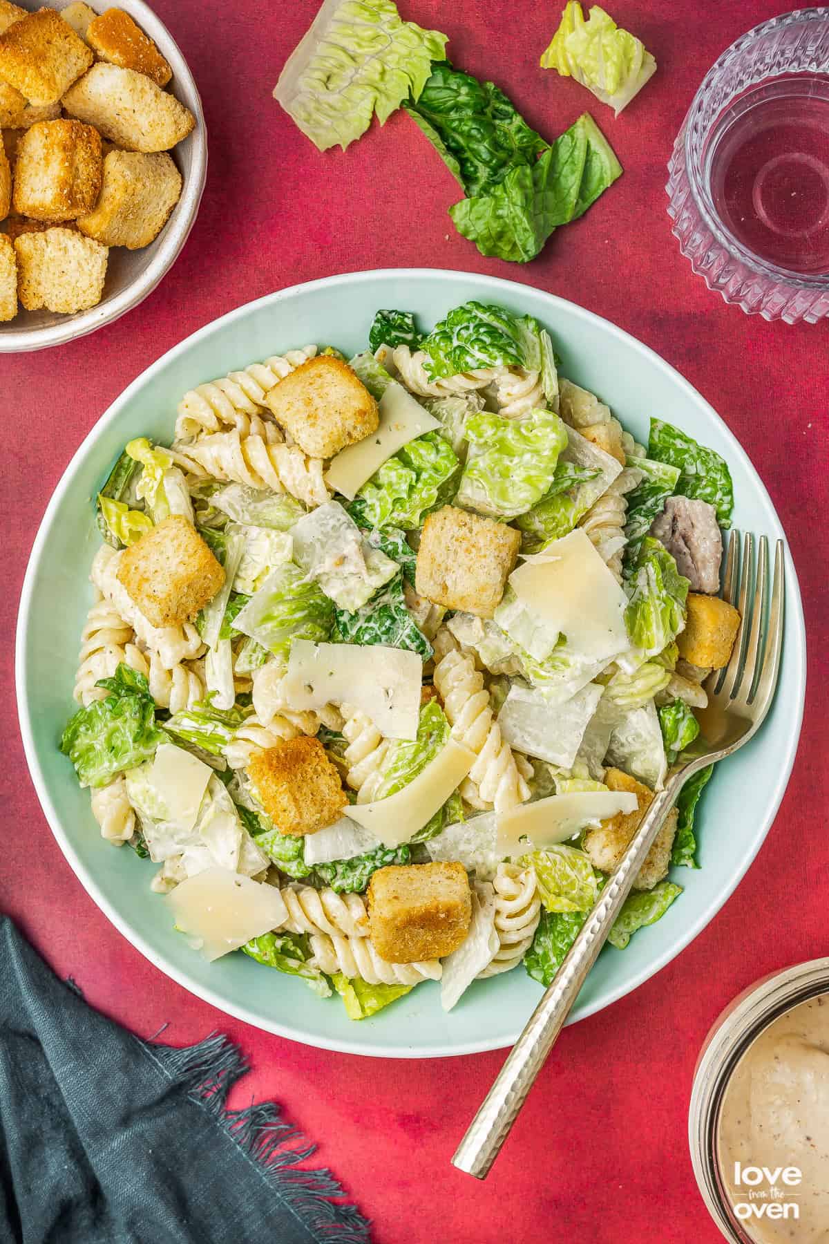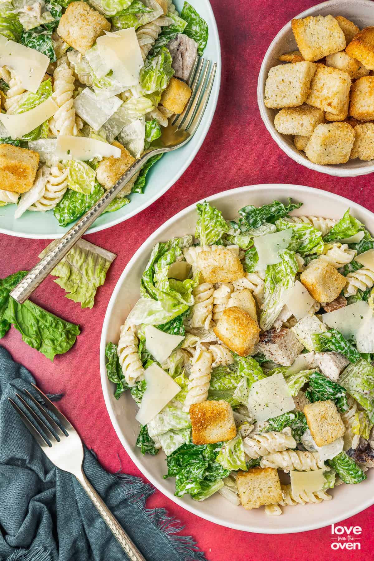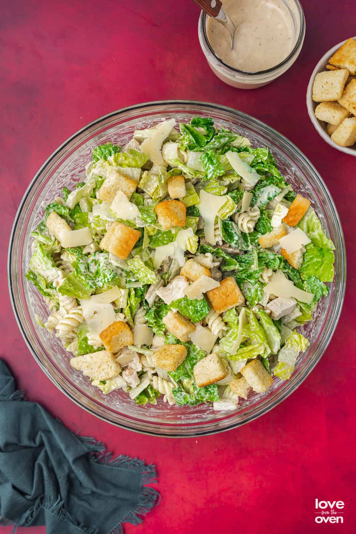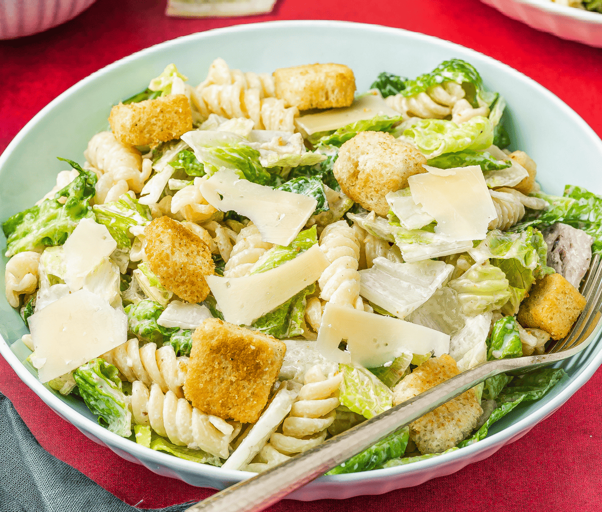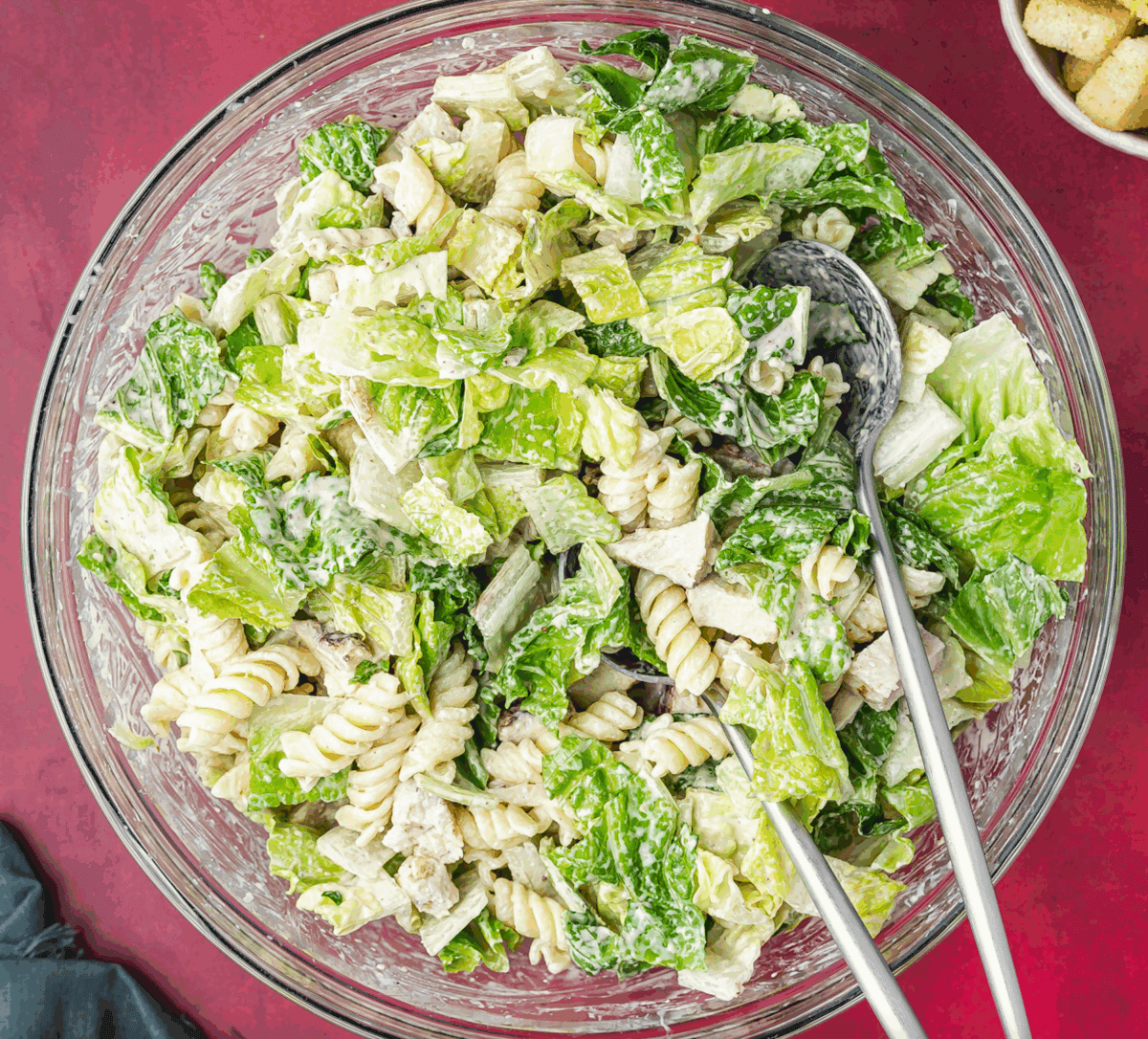 Storage – Store the leftover chicken cesar pasta salad in an airtight container in the fridge for 2-3 days. Personally, I don’t enjoy the texture of dressed lettuce sitting in the fridge, so if I were making this with the intention of having leftovers, I would store the dressing, pasta, chicken and lettuce all separately then toss a serving when I’m ready to eat.