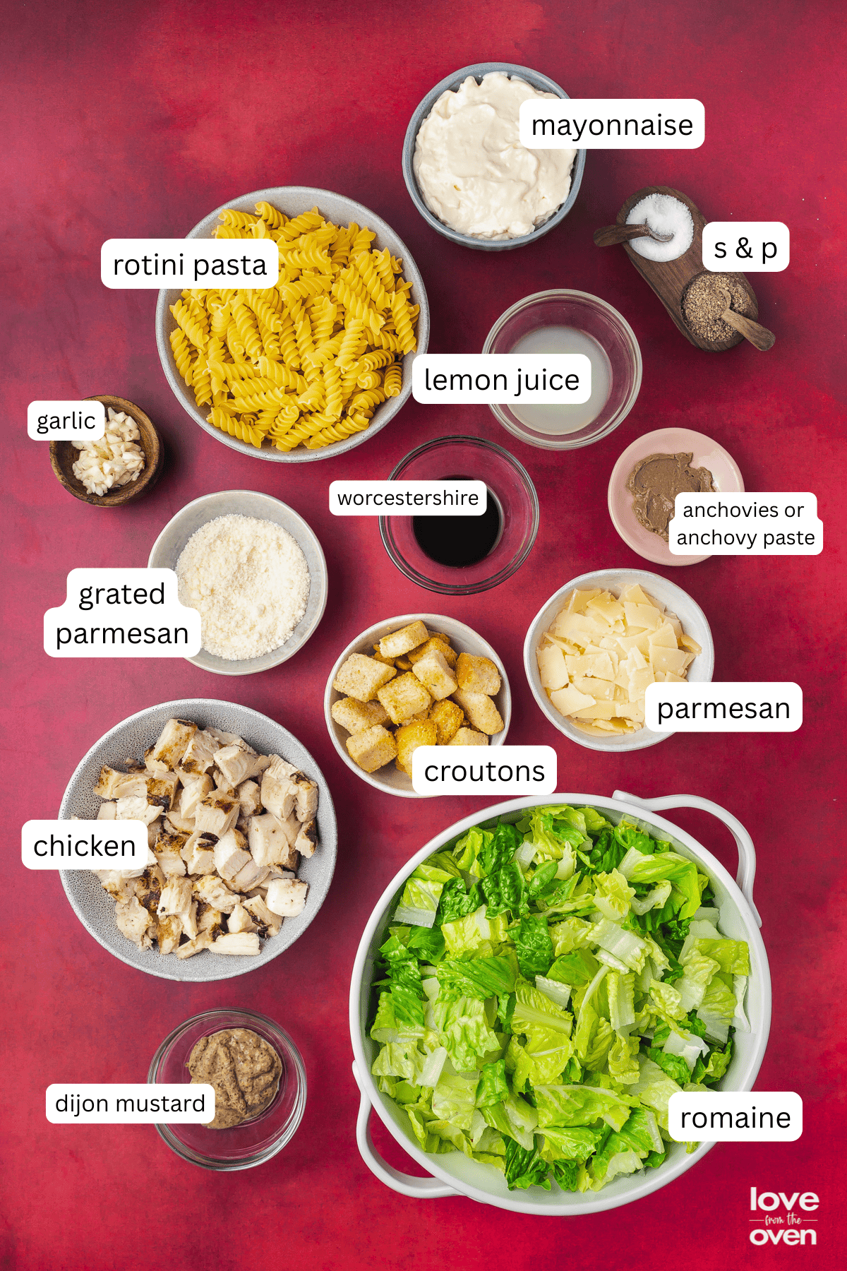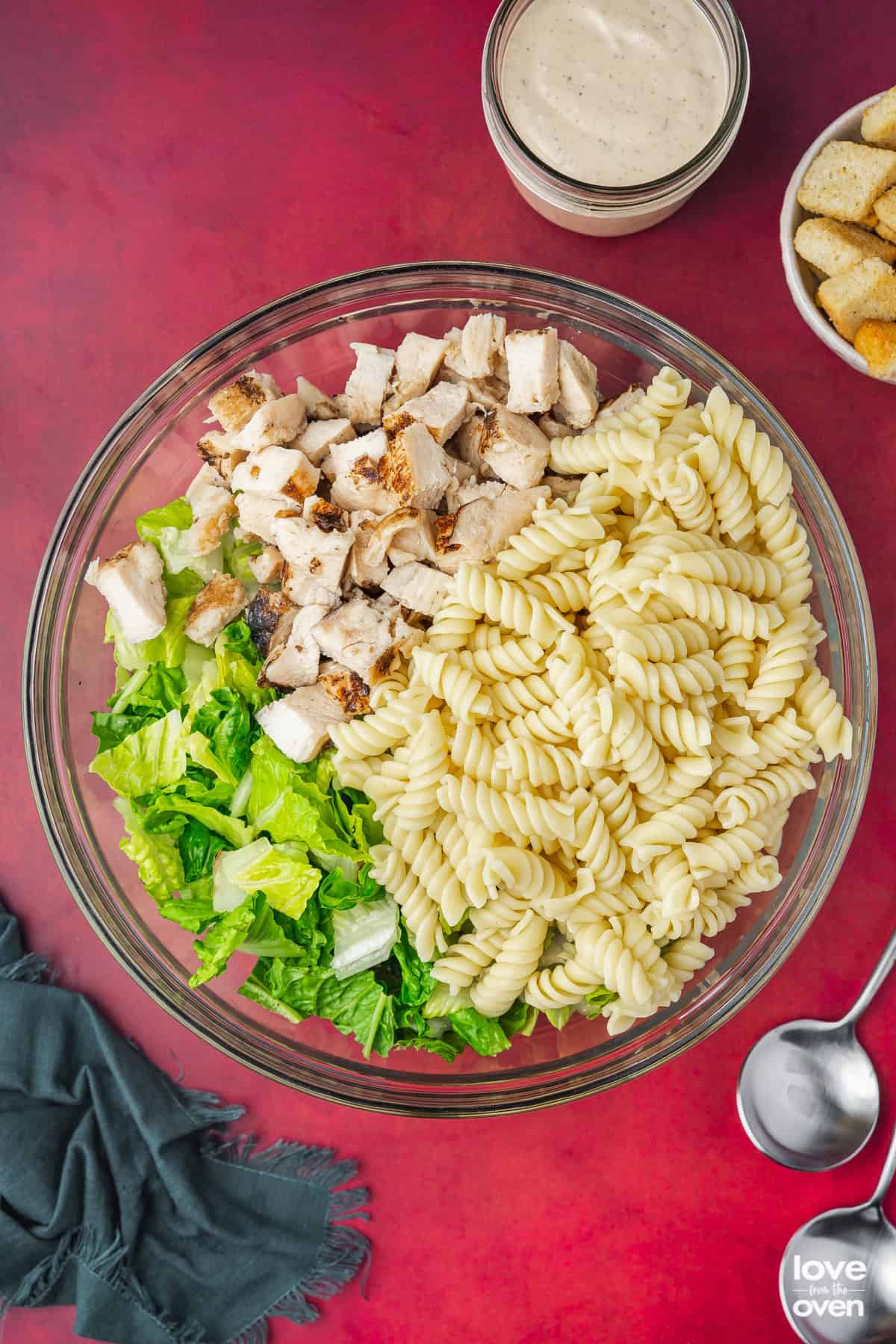 You’ll need a Caeser dressing, chicken, pasta and lettuce. The rest of the toppings can be up to you!