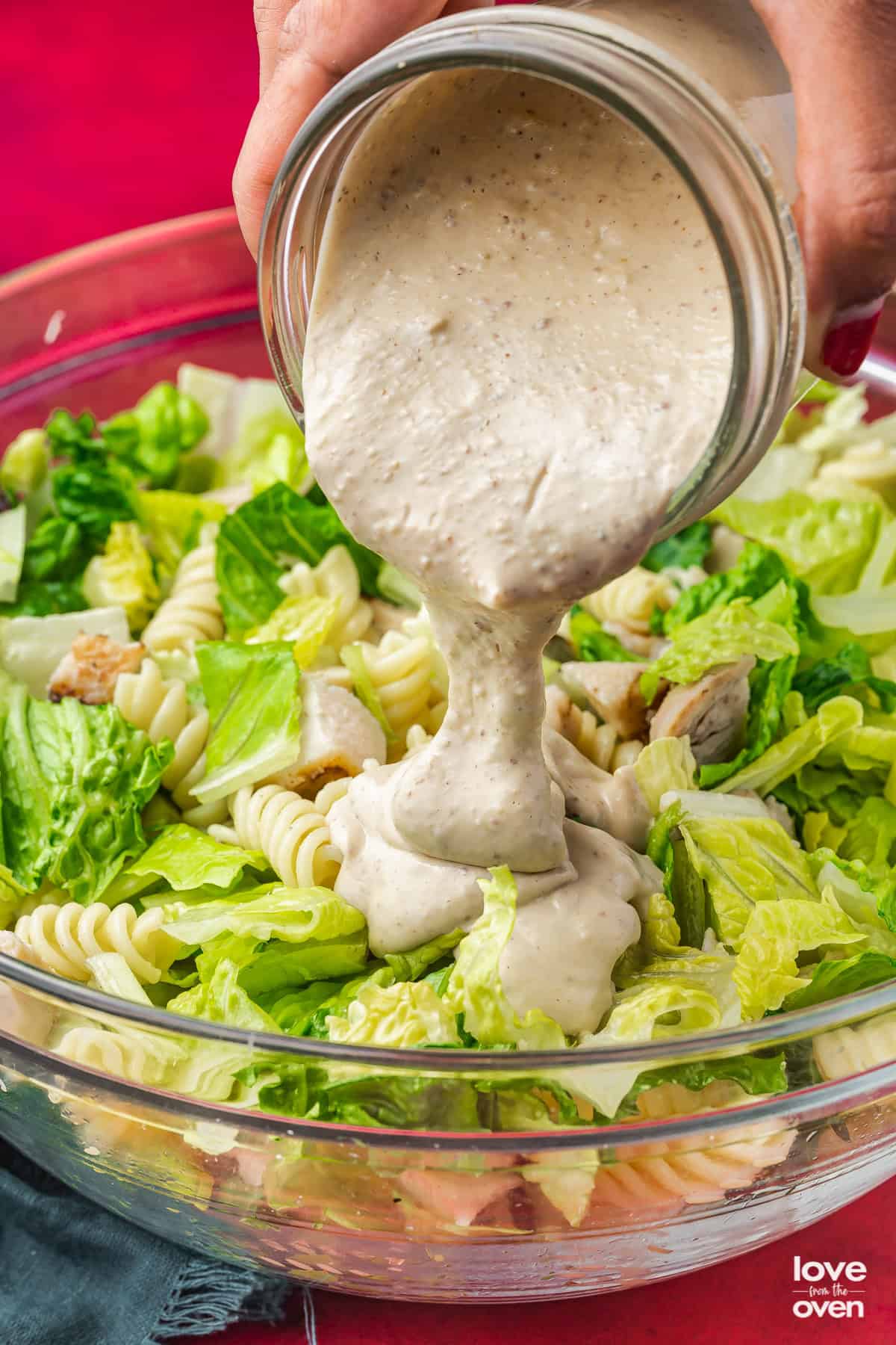 - Chop lettuce and add it to the bowl with the pasta. Add the chicken and pour the dressing over top. Toss to combine.