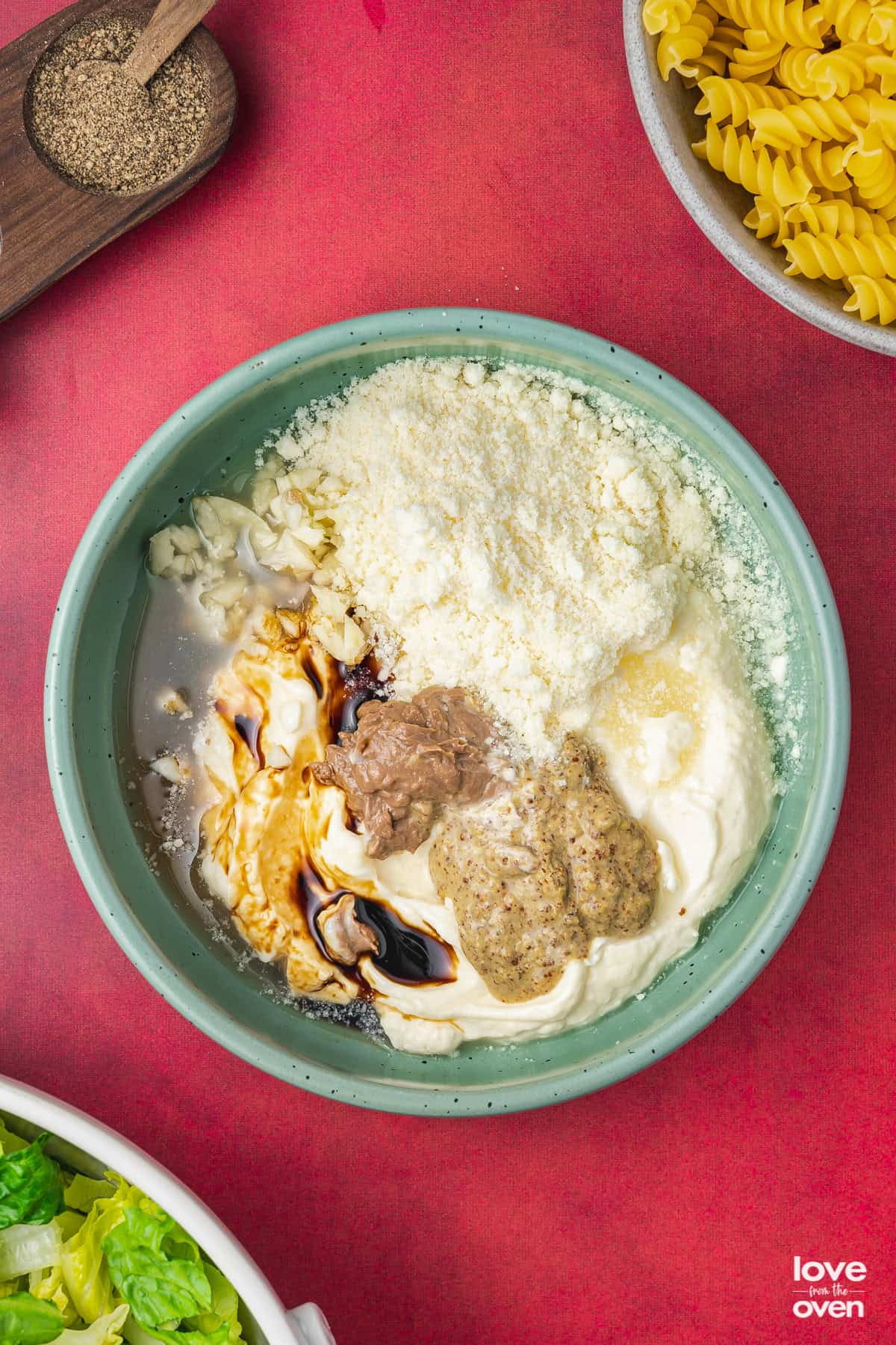 - Add the minced garlic, mayonnaise, parmesan, anchovies, lemon juice, Worcestershire sauce, and Dijon mustard to a large bowl and whisk well. Season with salt and pepper as needed. Set aside in the fridge.