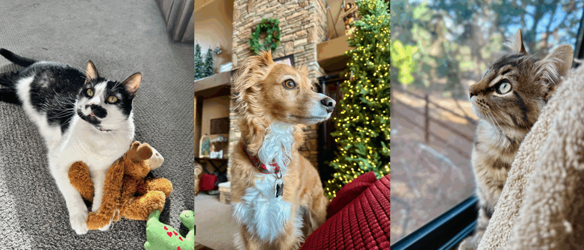 We have three pets who pretty much run the show – a mixed breed dog named Loki and a tuxedo cat named Max, who both were found through local rescues. Thanks to the cat distribution system we recently added a third pet, a tabby cat named Leo, who found us.