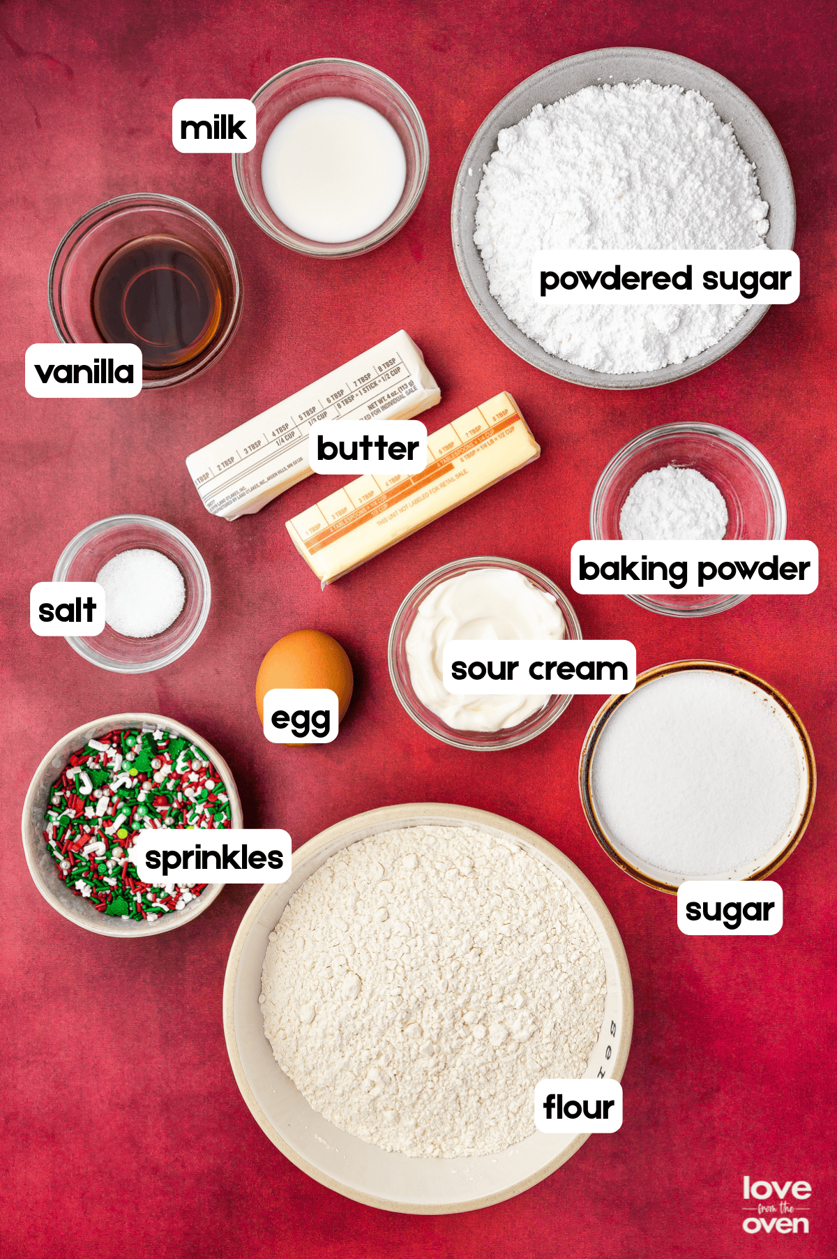 - Sugar – You’ll need white granulated sugar for the cookie base, and powdered sugar for the frosting.