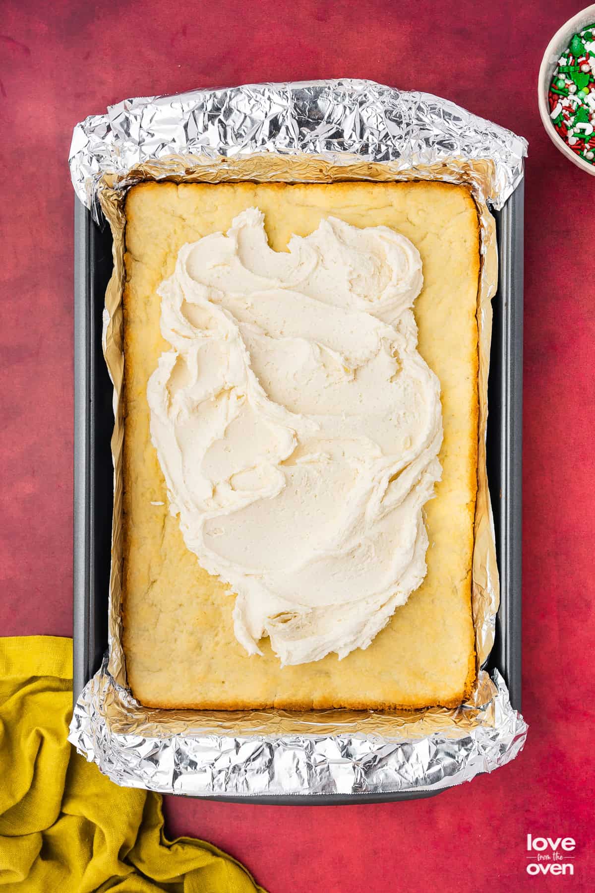 - To make frosting, combine softened butter and powdered sugar in a bowl and mix with an electric mixer until well combined. Once the bars have cooled completely, frost, then add sprinkles to the top. Cut into even squares, then serve. Enjoy!