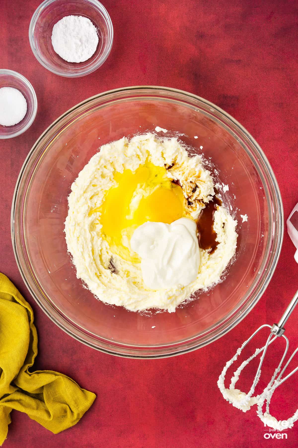 - Add softened butter and sugar to a bowl and mix with a handheld or stand mixer for 2-3 minutes or until fluffy. Add in the egg then sour cream and beat until combined. Add flour, baking powder and salt, and fold it all together until just combined. Try not to over mix.