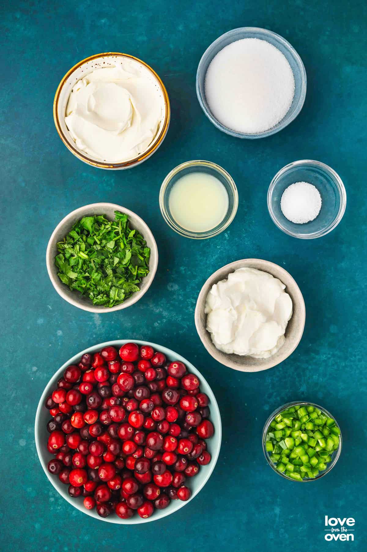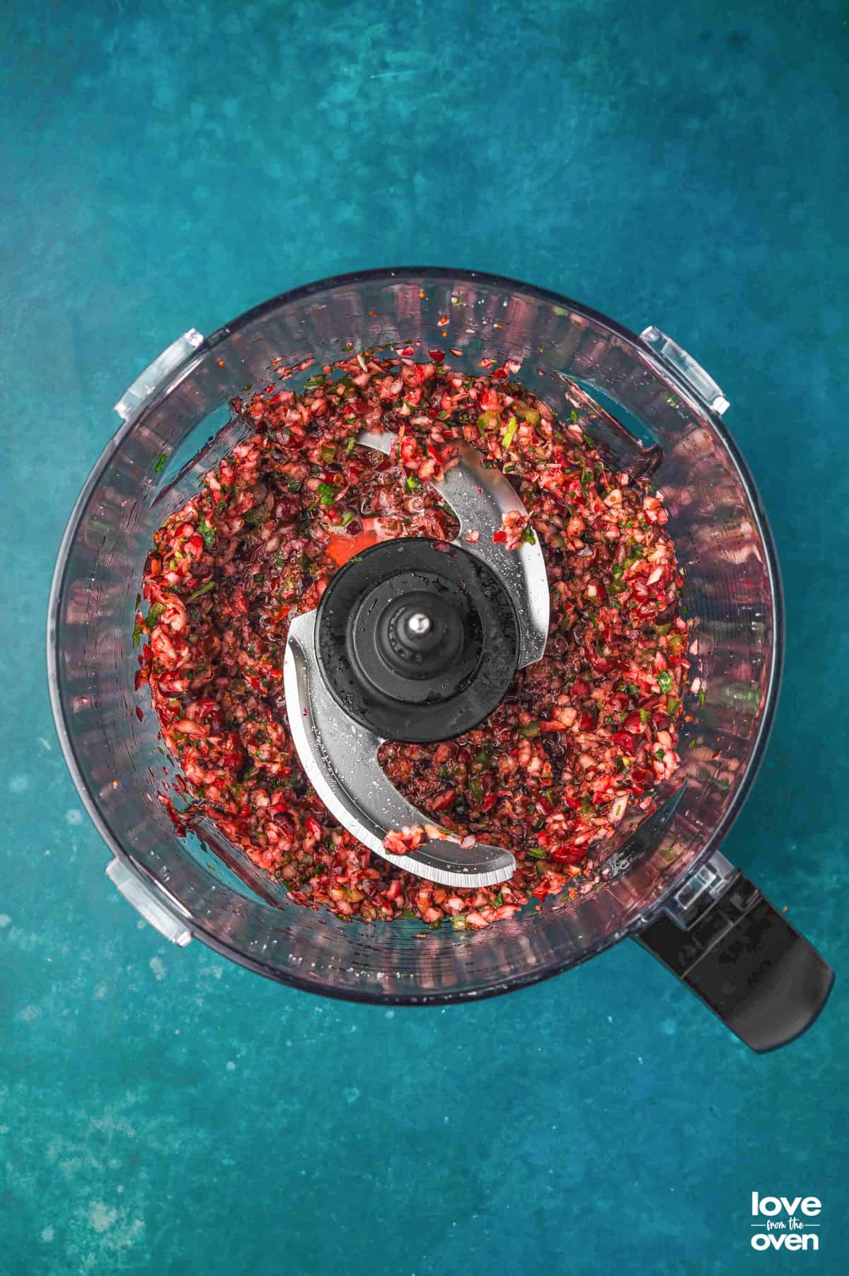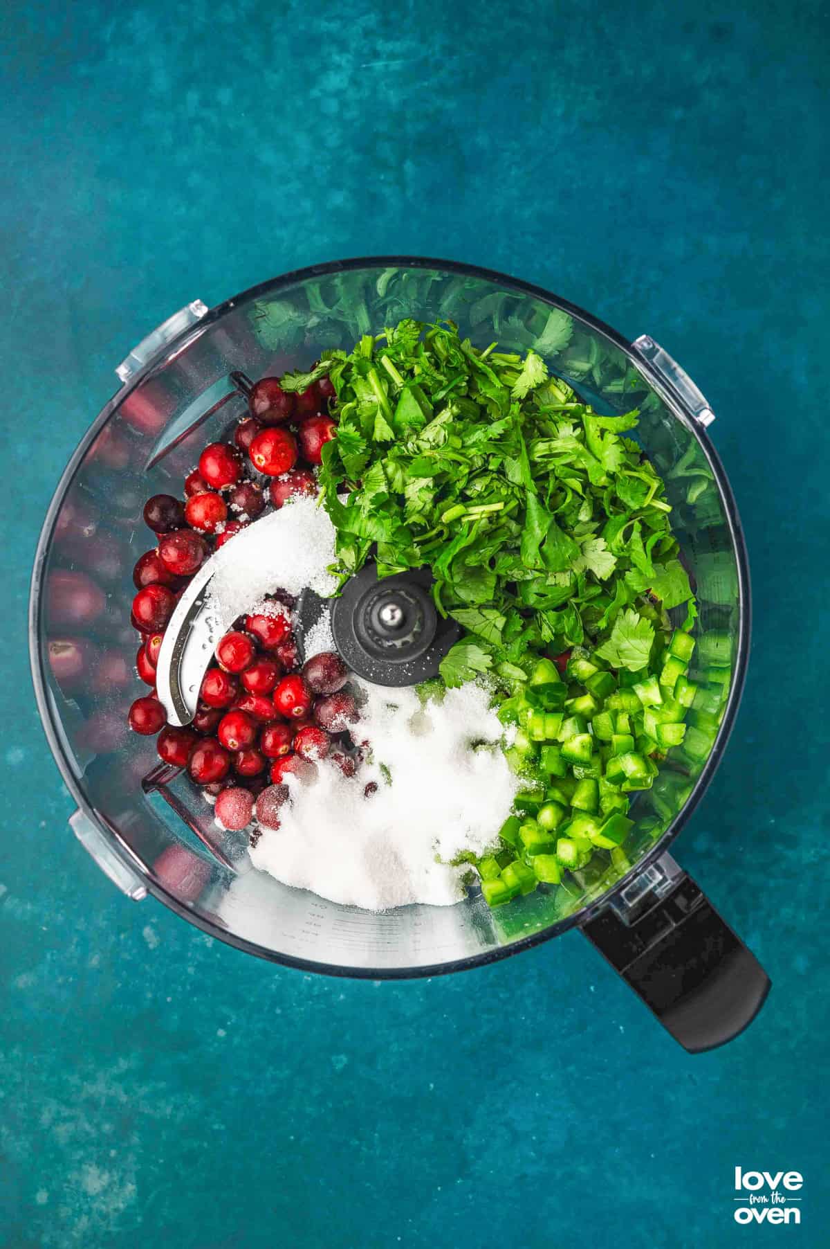 - Start by adding the cranberries, jalapeno, cilantro, sugar, lime and salt to a large food processor. Gently pulse a few times until the mixture is finely minced.