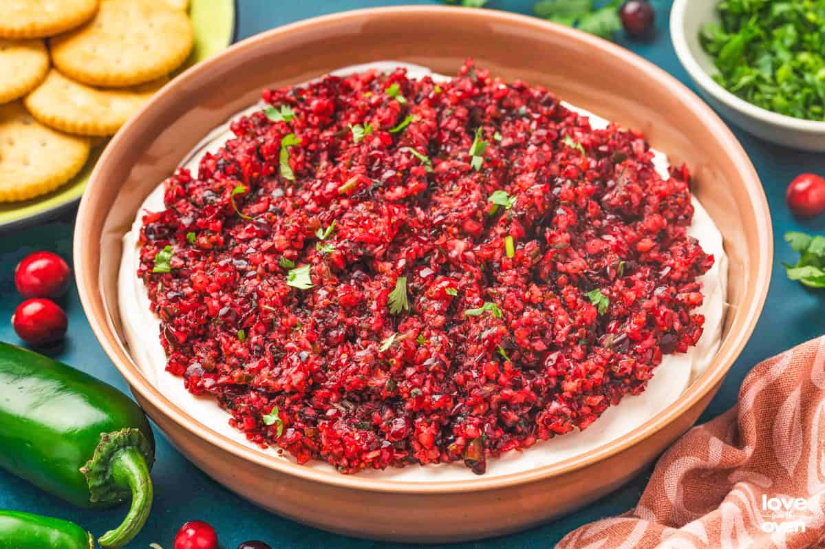This addictive, crowd-pleaser Cranberry Jalapeno Dip is the perfect appetizer to bring to any occasion! Bright, fresh cranberries are finely minced and blended with zesty jalapeños and fragrant herbs, creating a vibrant, flavor-packed topping that sits on a rich, creamy cream cheese base. I love to serve this on a tray with some crackers, bread or with cut up fruit and veggies for the perfect, simple, no-bake appetizer.