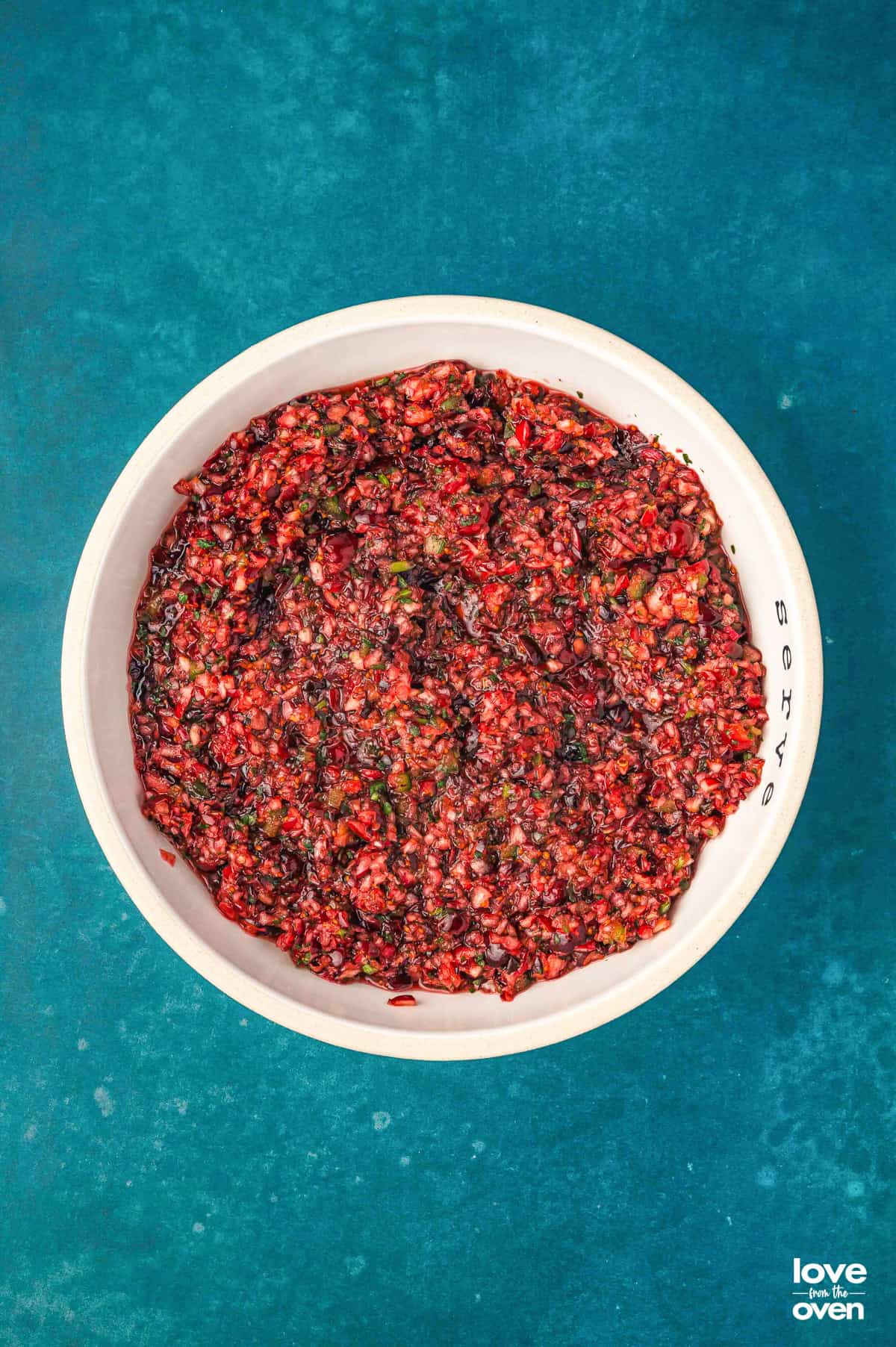 - Pour the minced cranberry mixture into a bowl or container, cover it, and store it in the fridge for no less than an hour to let the flavors marinate.