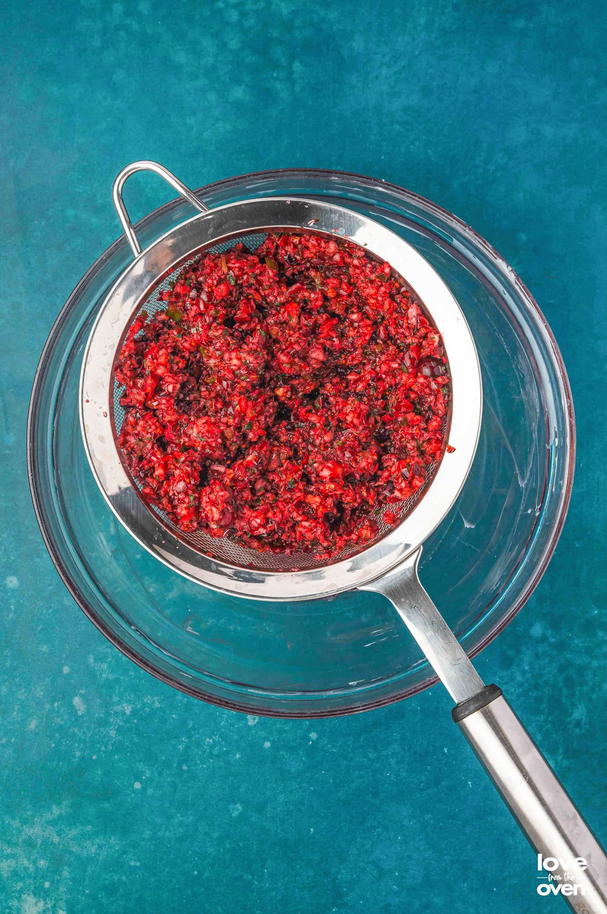 - Once it’s done chilling, remove the cranberry mixture from the fridge. Use a fine mesh sieve to drain the excess liquid from the mixture. Remove the cream cheese from the fridge. Assemble the dip by spooning the cranberry mixture evenly over the cream cheese.