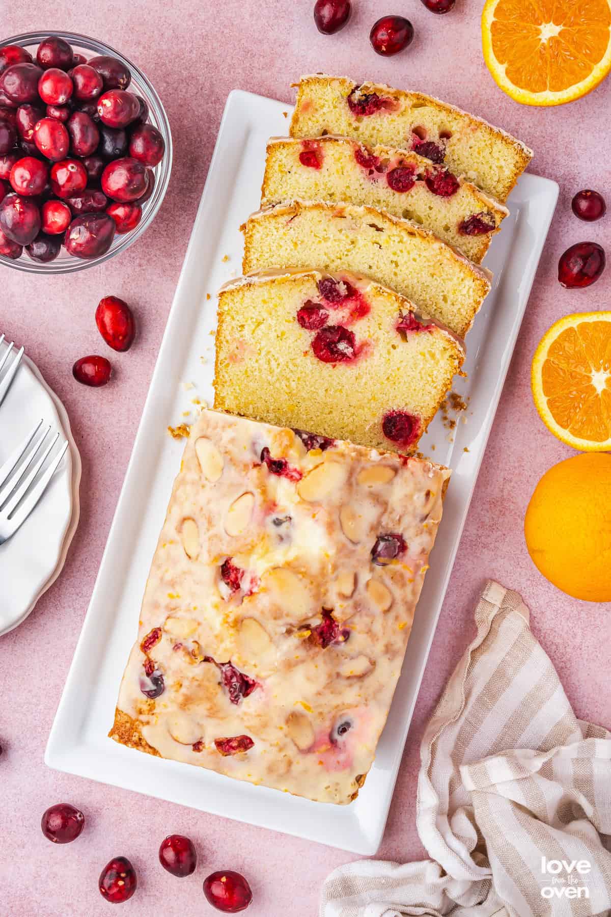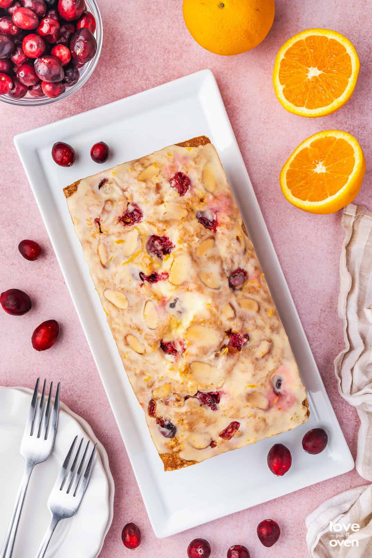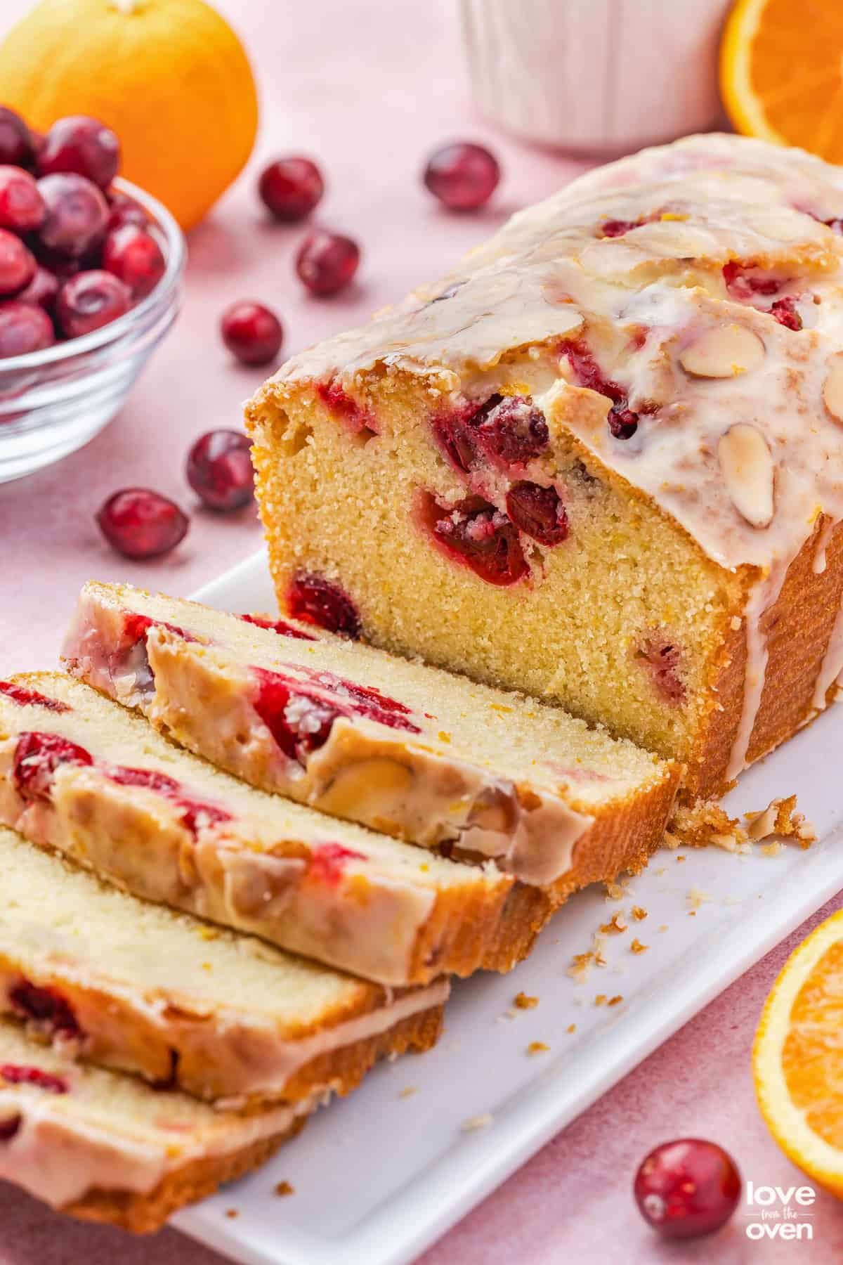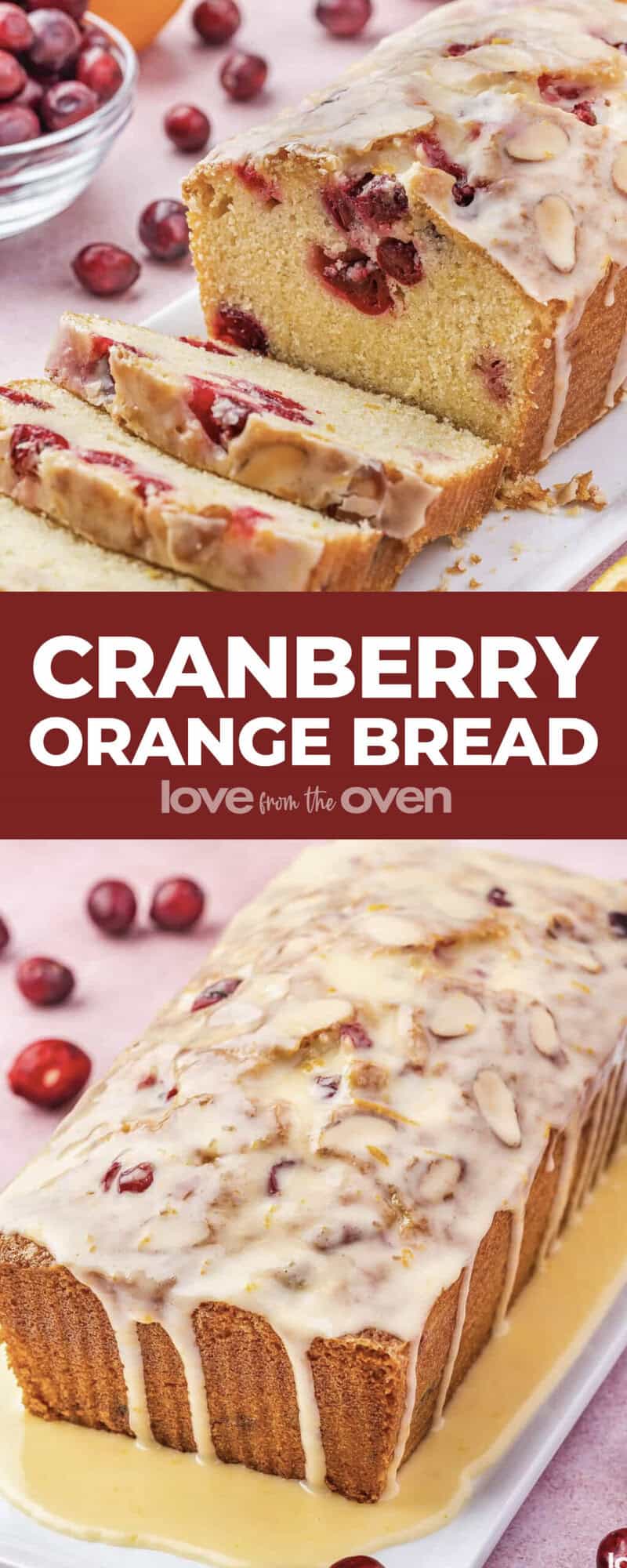 Cranberry Orange Bread is a beautiful fragrant bread that is packed with a bright, citrus flavor and juicy pieces of cranberry! This cake-like loaf is a simple sponge base that’s loaded with orange zest, cranberries, topped with almonds and sugar, baked, then garnished with a stunning orange glaze! Not only is this cranberry orange loaf a gorgeous work of art, it tastes incredible as well!