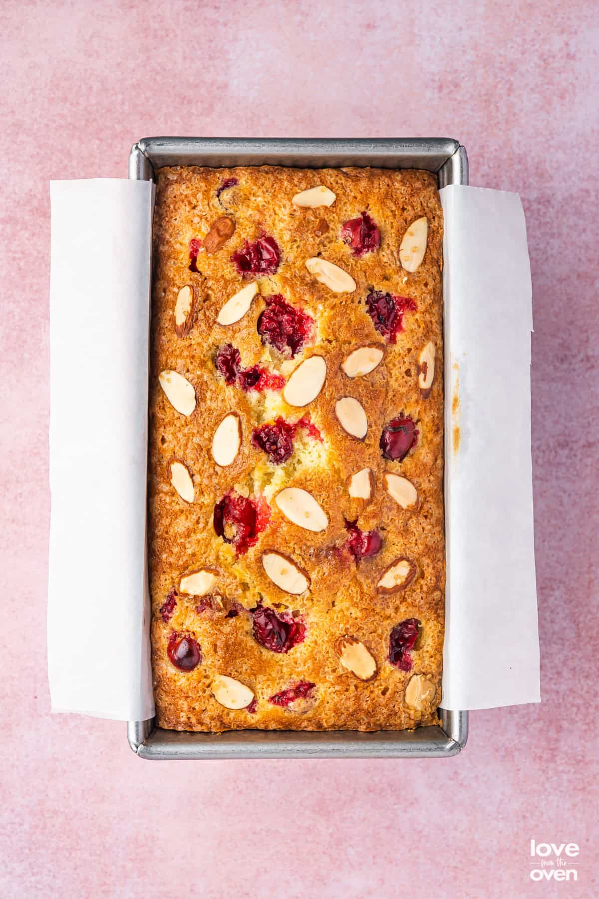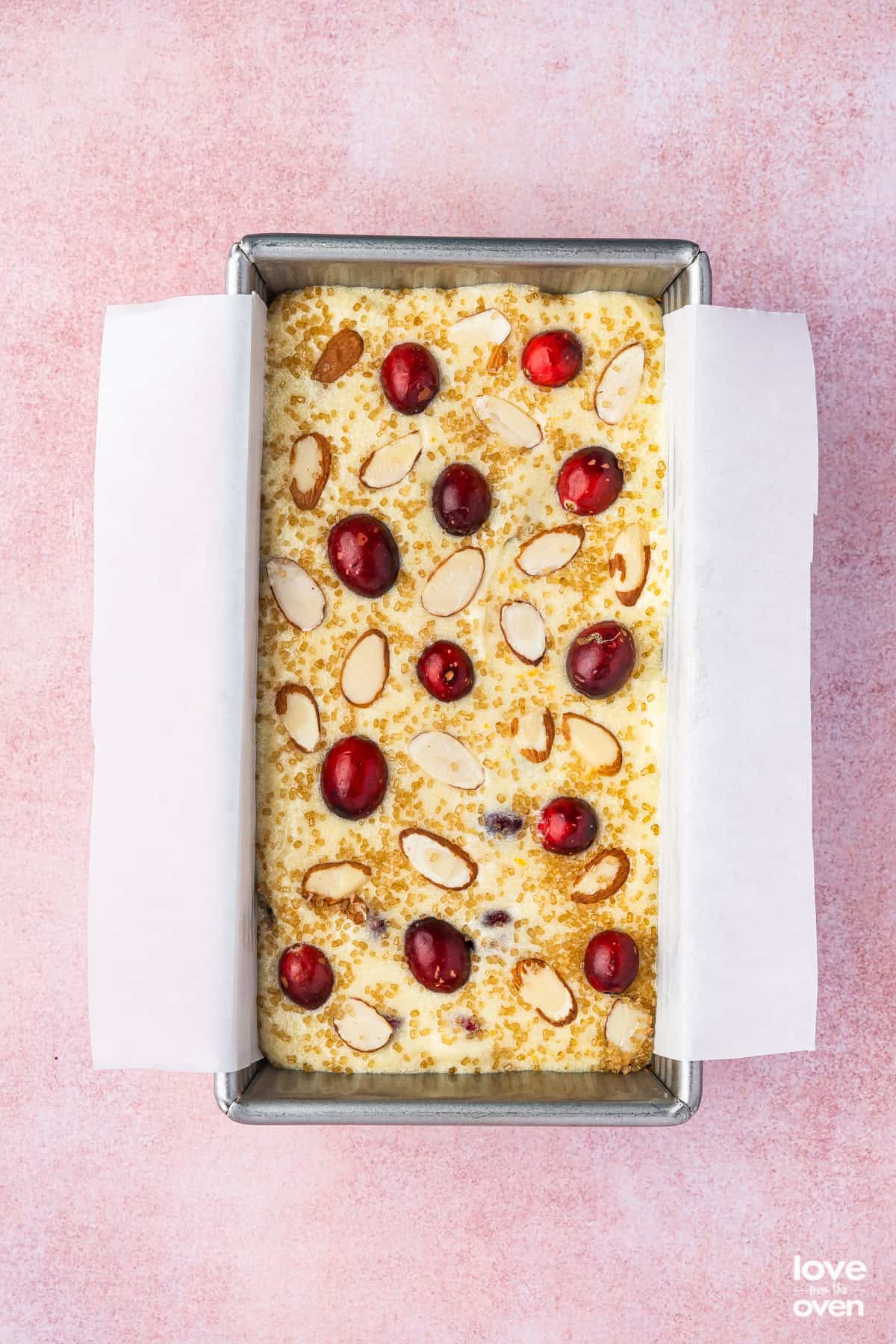 - Add the dry ingredients in increments to the cream mixture and fold together until just combined. Do not over mix. Add most of the cranberries (save a few to sprinkle on top) and fold that into the batter. Pour the batter into the lined loaf pan and even out the top with a spatula. Sprinkle the remaining cranberries and sliced almonds on top of the batter, then finish with the turbinado sugar on top.