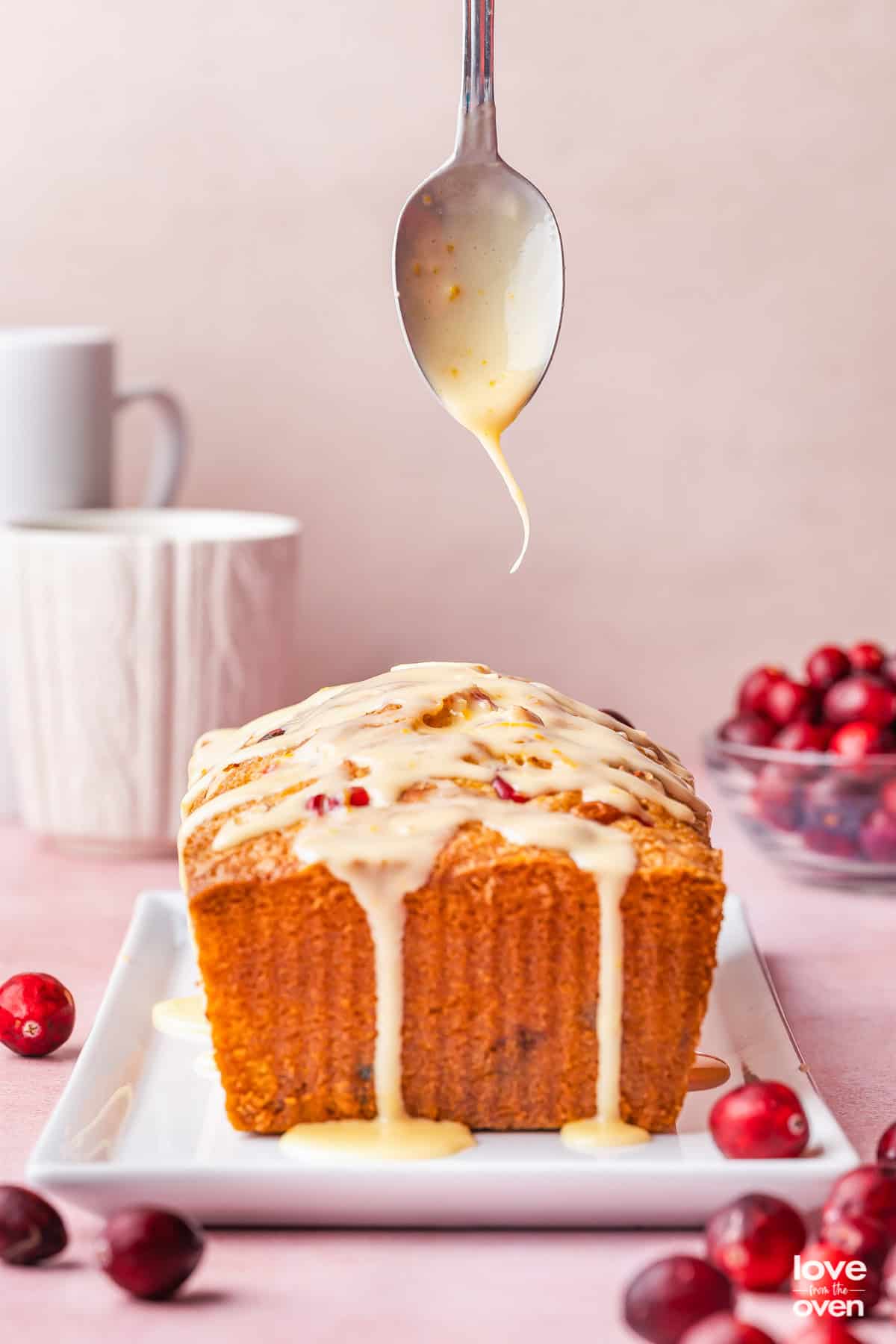 - While that cools, start on the glaze. Add powdered sugar to a bowl, orange juice and orange zest. Whisk together until smooth. Once the bread has cooled completely, pour the glaze over the top. Slice, serve and enjoy!