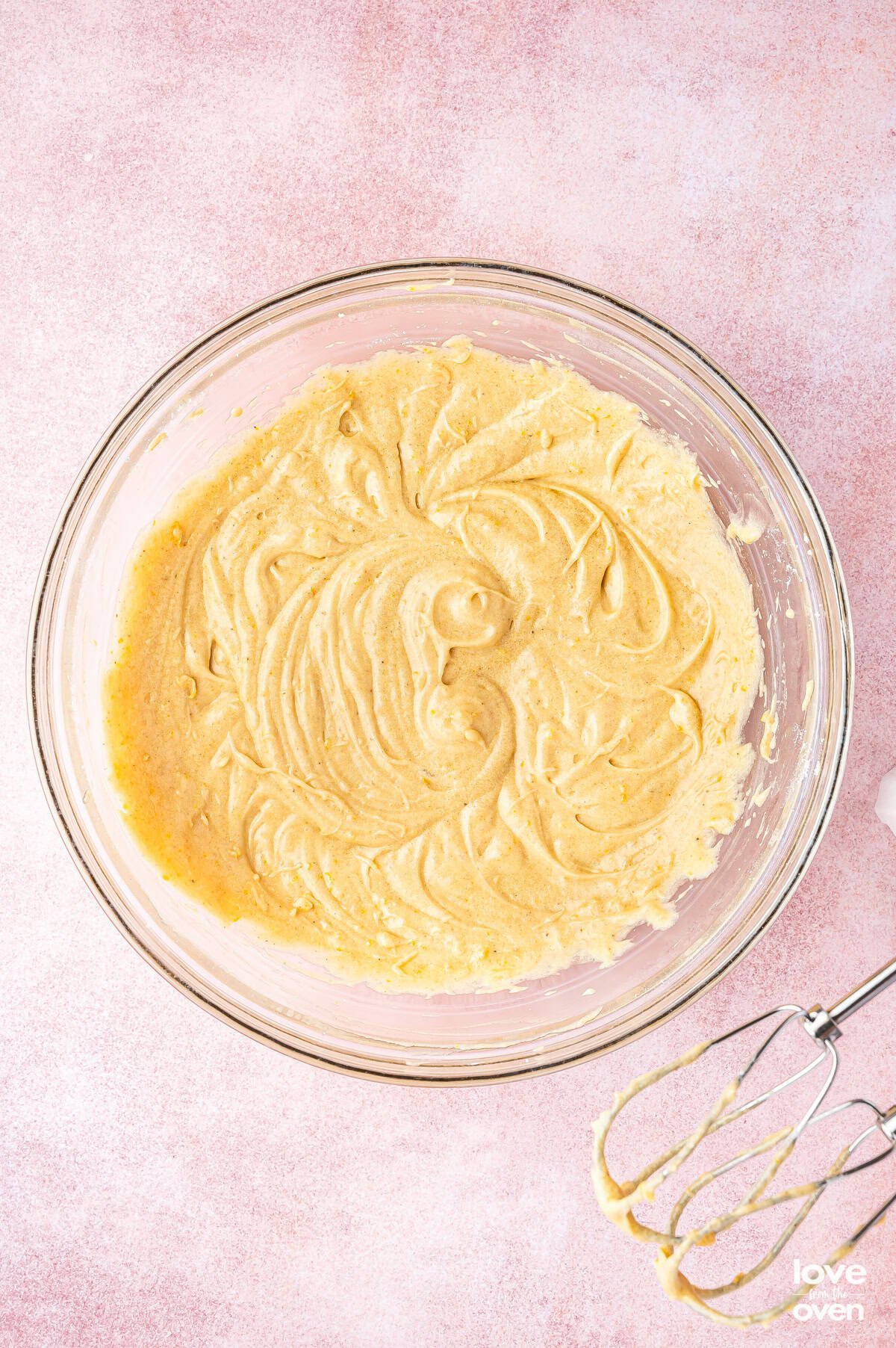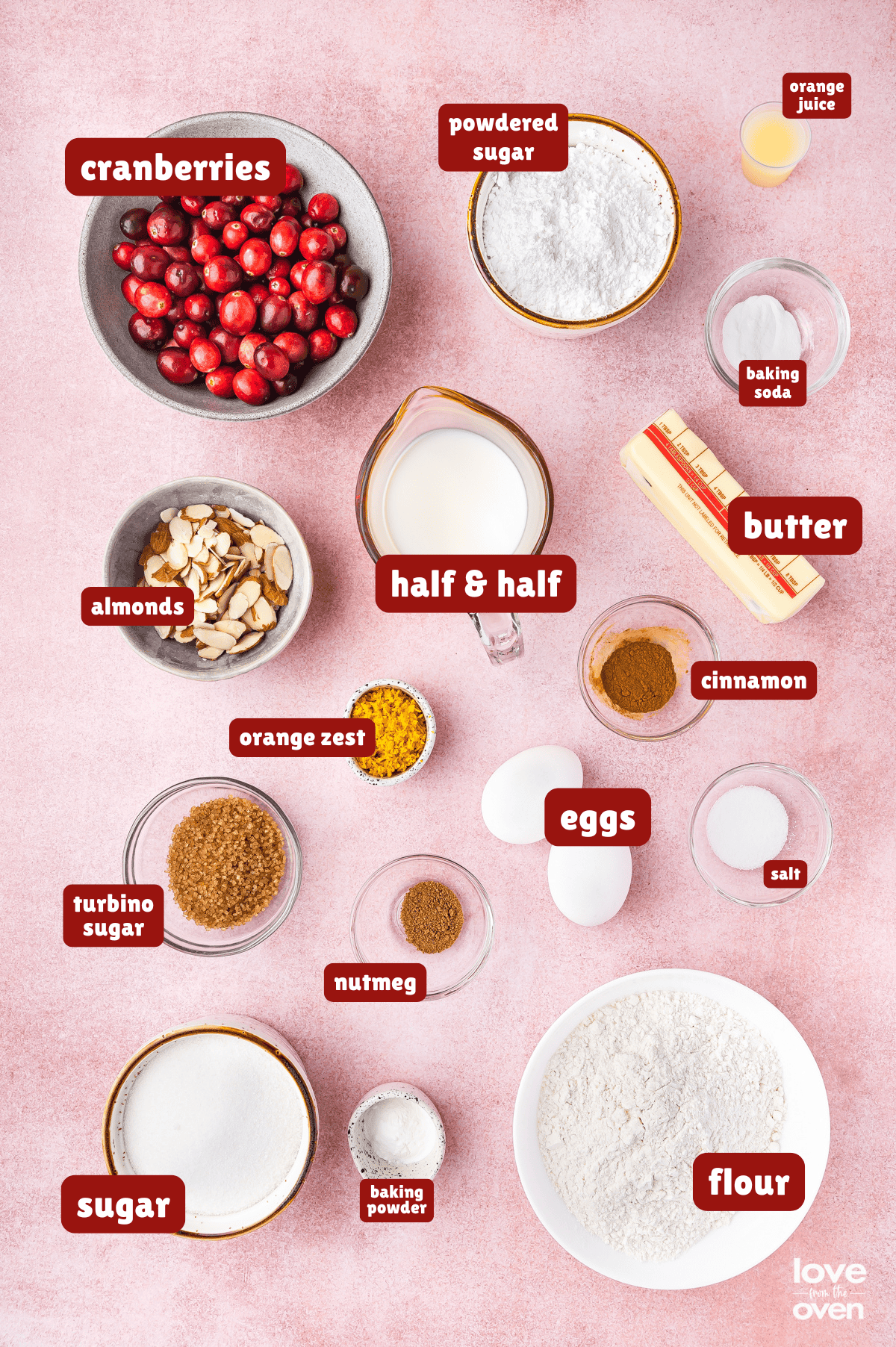 - Grab a large mixing bowl. Add flour, baking powder, baking soda, salt, cinnamon and nutmeg. Whisk together until combined. Set aside. In a separate mixing bowl, add the softened butter and sugar. Beat that with a hand or stand mixer until light and fluffy. Add the eggs, half and half and orange zest. Continue to mix until combined.