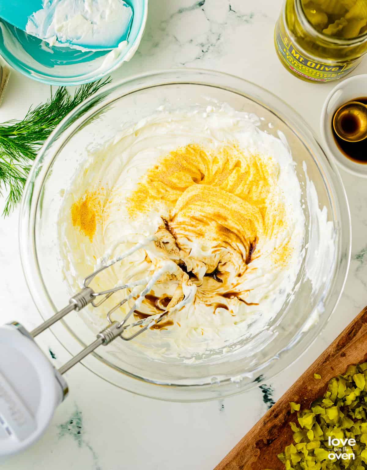 - Dice up the pickles into smaller pieces. Set aside. In a large bowl, whip the cream cheese with a hand mixer or a wooden spoon until the consistency is smooth. Once smooth, add the sour cream and mix until combined.