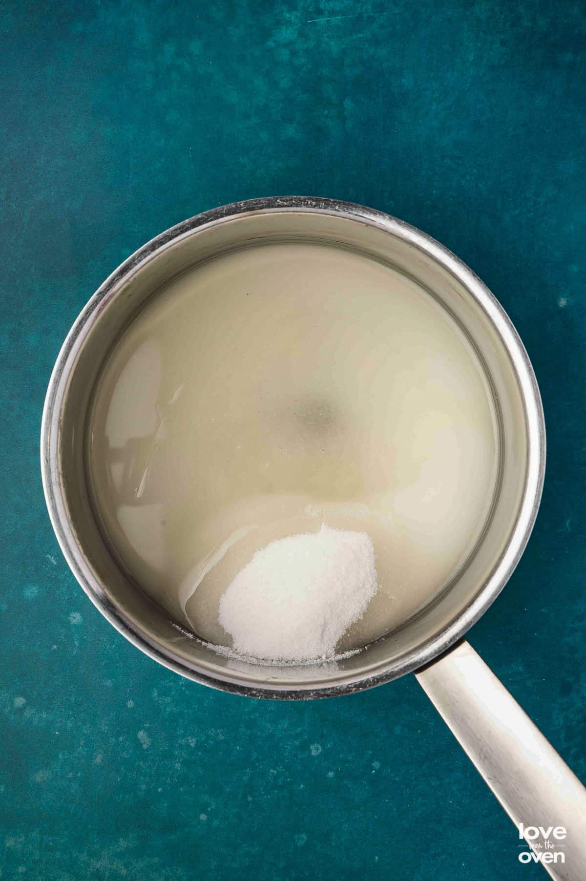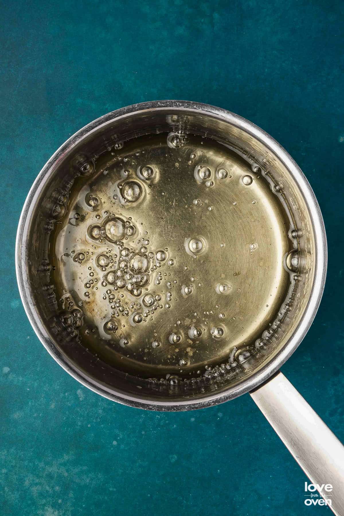- Dissolve sugar, syrup and water in a saucepan. Stir then remove from heat once done.