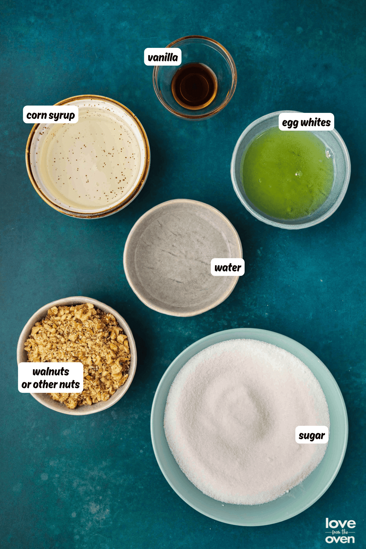 - Beat the egg whites until stiff peaks form. Slowly pour in the hot syrup, beat some more then add the vanilla. Gently fold in the chopped nuts.
