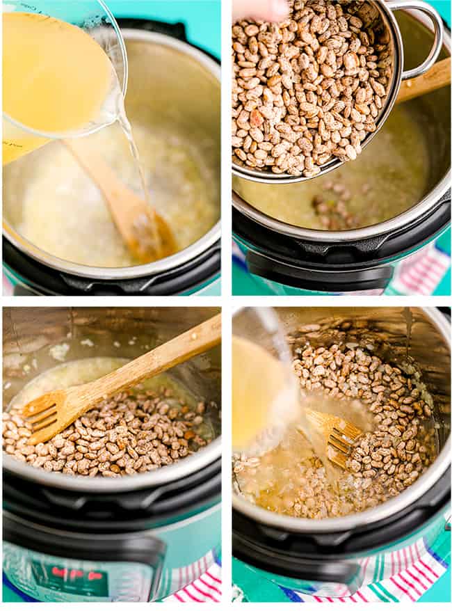 Pour some of the chicken stock into the Instant Pot, deglaze the pot, and then add your pinto beans, more chicken stock, cumin, pepper, and salt. Make sure you scrap the bottom of your Instant Pot to get rid of any stuck on bits of food.