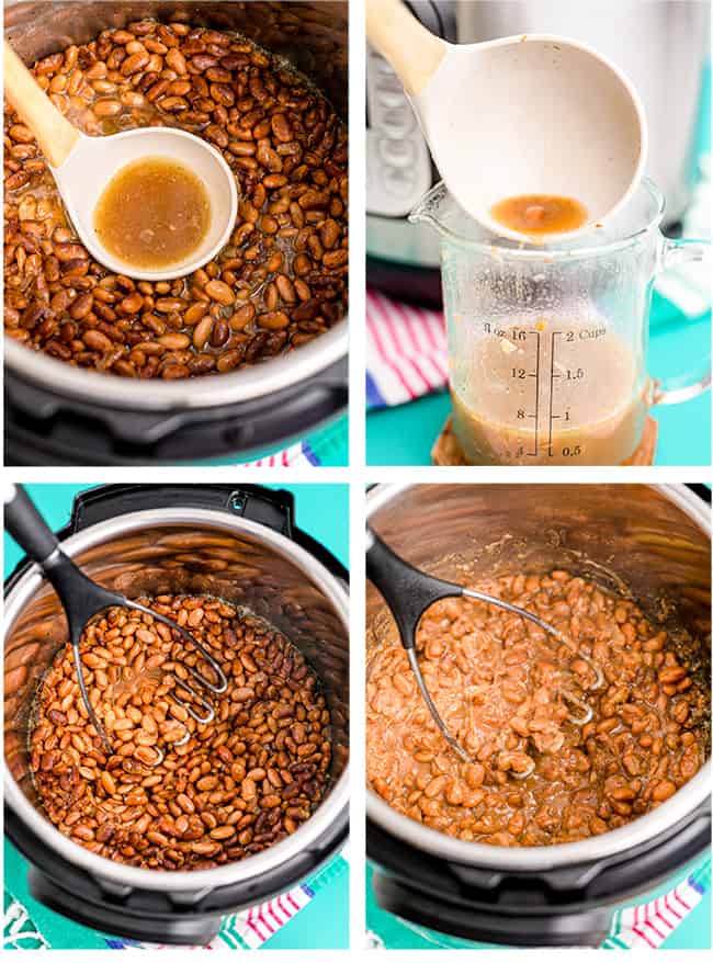 - Use a ladle to remove about a cup of liquid from the pot. Mash or blend the beans using a potato masher. Add in the saved liquid as necessary to reach the desired consistency. Taste and add more salt if desired. Serve with desired garnishes.