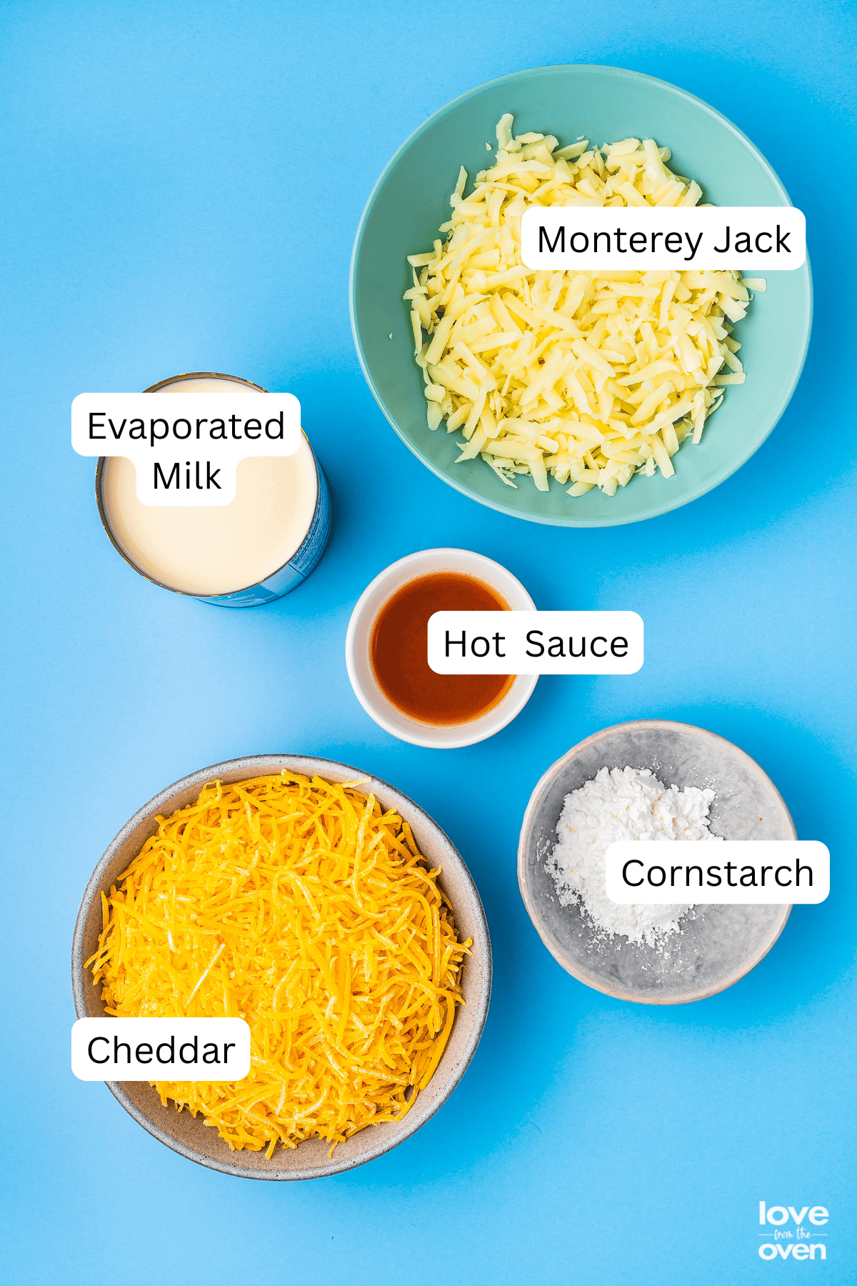 Monterey Jack and Sharp Cheddar are the ideal pairing and will give you that orange Nacho Cheese color, and consistency. However you can substitute them for other cheeses like Colby Jack, Pepper jack for some spice, or sharp white cheddar. American cheese will give you a more melty consistency. If you use American cheese I recommend getting it fresh from the deli counter.