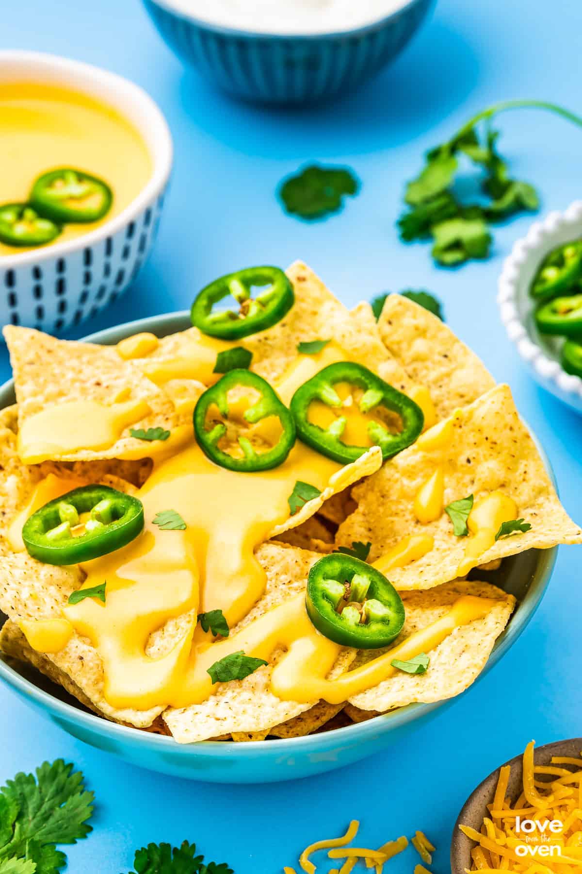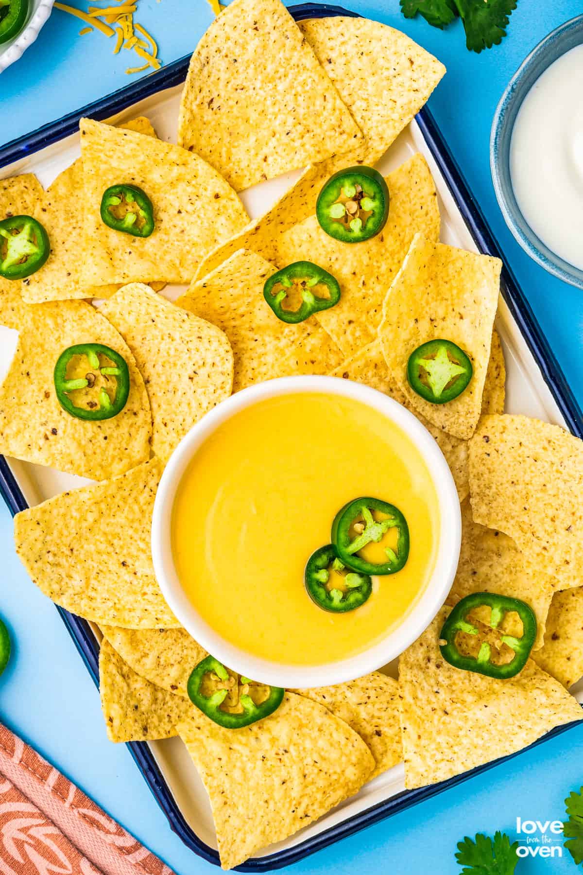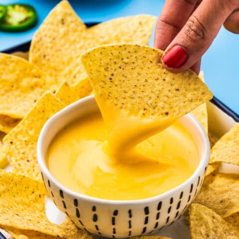 Serve With – Pair this Nacho Cheese Sauce with Tortilla Chips or other things like cut up veggies, french bread, or even soft pretzels! You can also serve it on top of some fries, tater tots or on tacos, bowls, burritos, etc. This really is a nice recipe to have under your belt for when you just need a good dipping sauce!