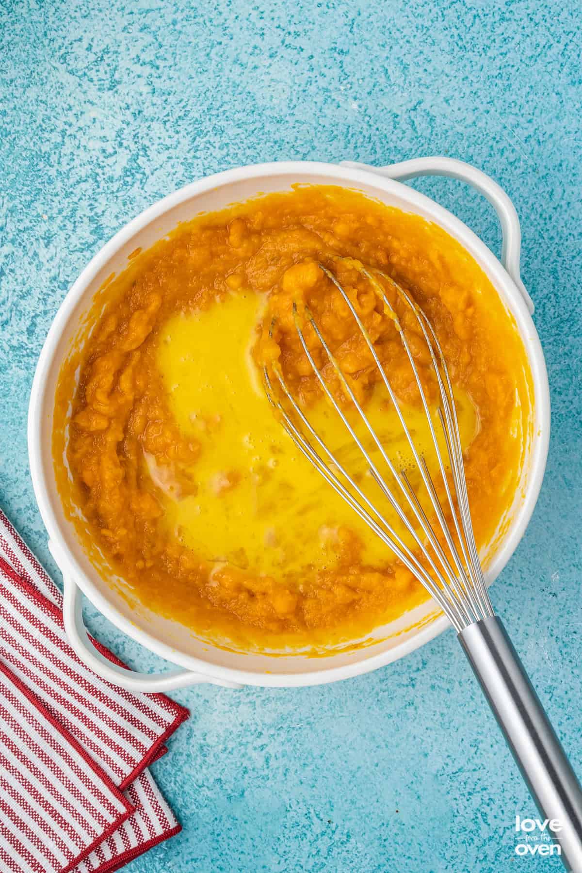 - In a separate mixing bowl, add the sugar, salt, vanilla, mashed sweet potatoes, a beaten egg and butter. Mix that together until well combined.