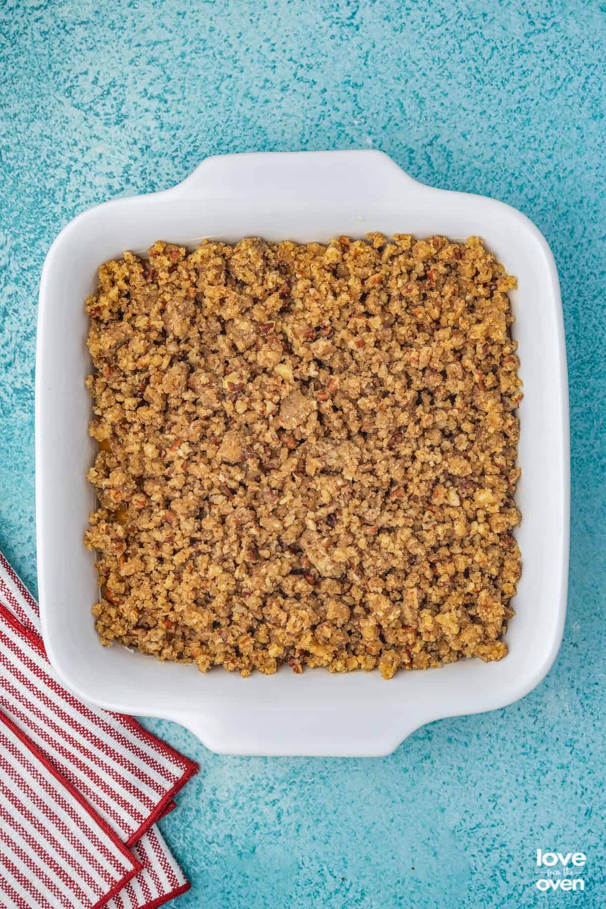 - Preheat the oven to 350°F. To a mixing bowl, add brown sugar, flour, chopped nuts and melted butter. Mix until combined. Set aside.