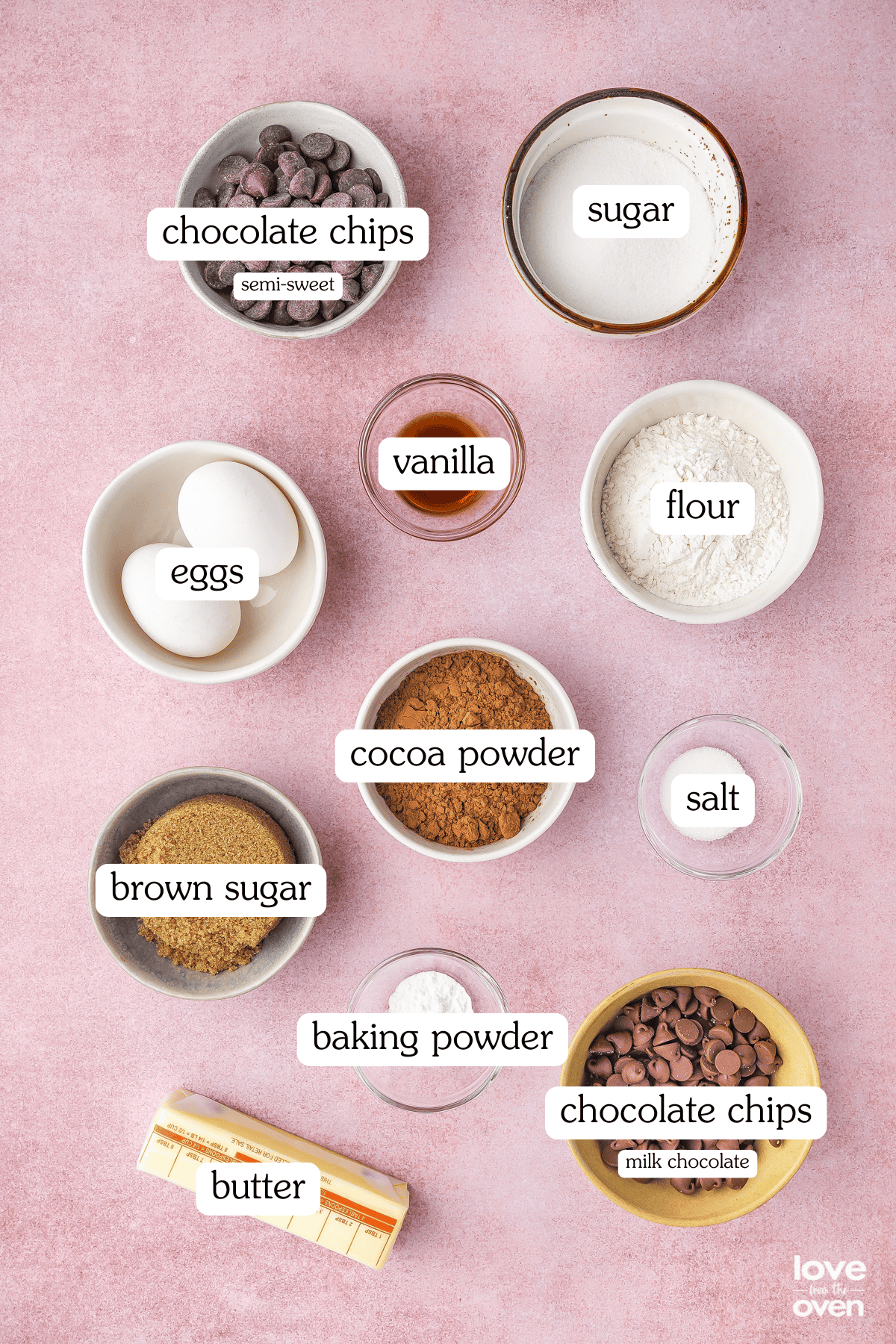 - Chocolate Chips – You’ll need semi-sweet for the batter, and milk chocolate for mix-ins. You can use semi-sweet in place for the milk or milk in place for the semi-sweet if you don’t mind the extra sweetness in your brownie batter.