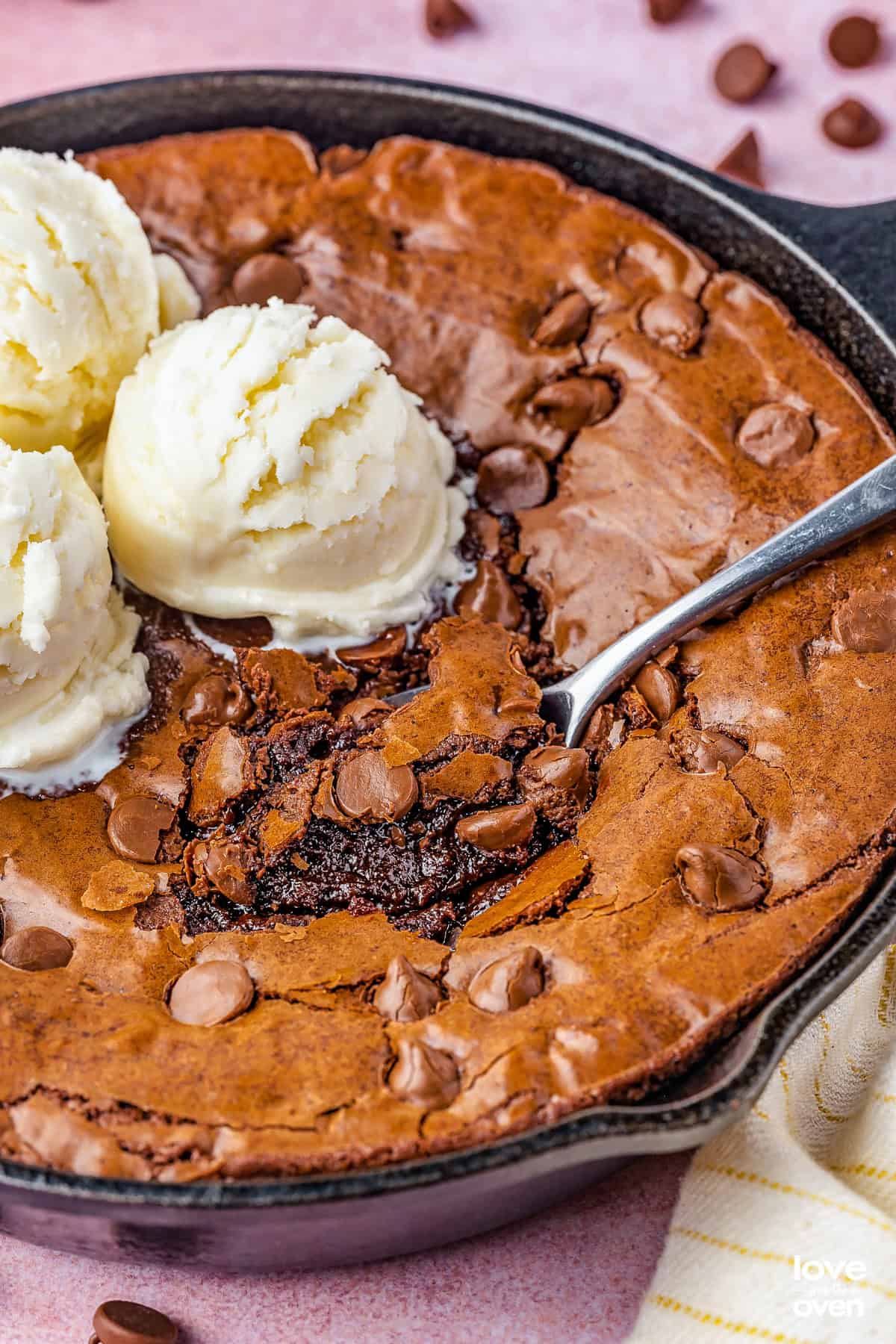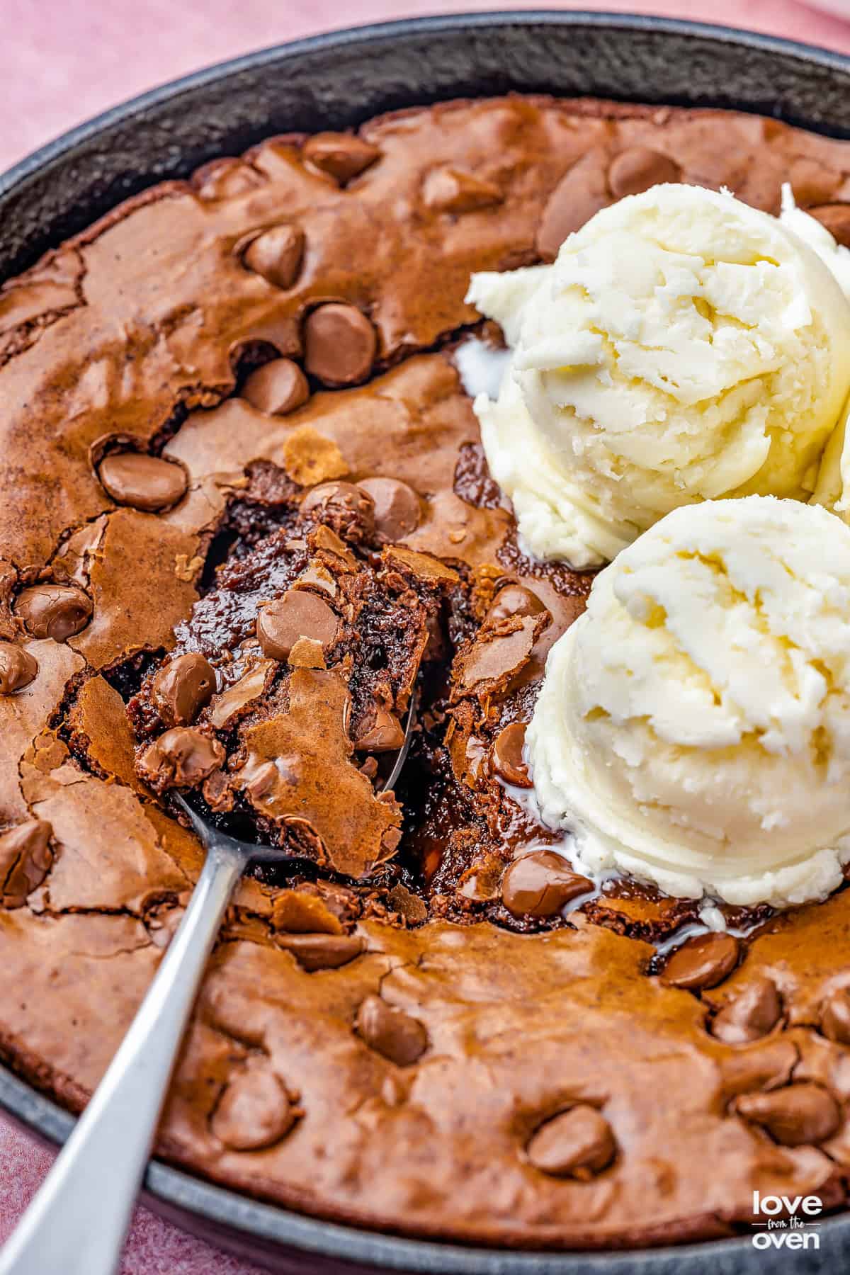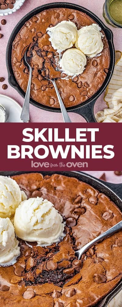Storage – If you’re eating the brownie out of the pan, especially if you put ice-cream on top, I don’t recommend storing the leftovers. If you didn’t, scoop the brownie out of the cast iron and transfer it to an airtight container, then store at room temp. for about a week, or freeze for up to 3 months. Leaving the brownie in the cast iron could damage your pan.