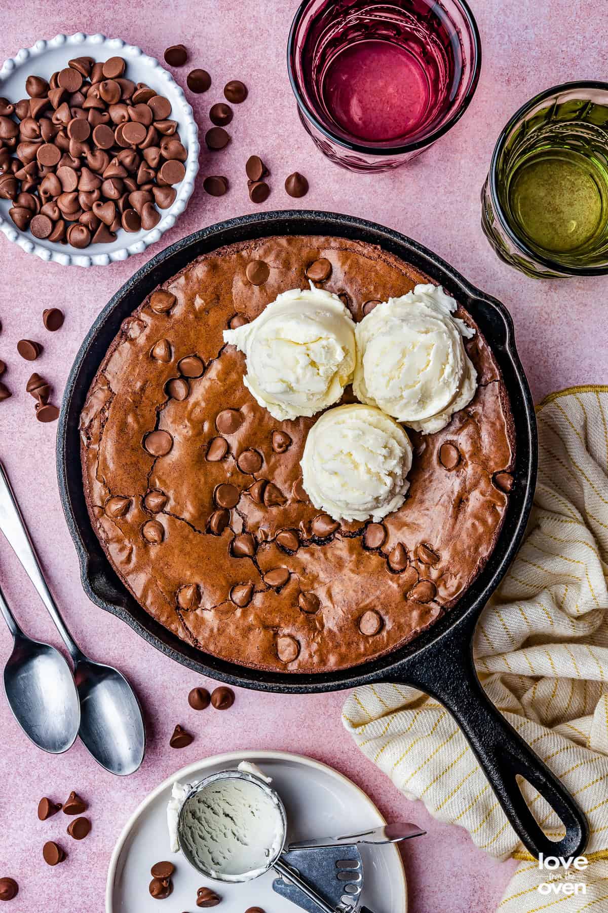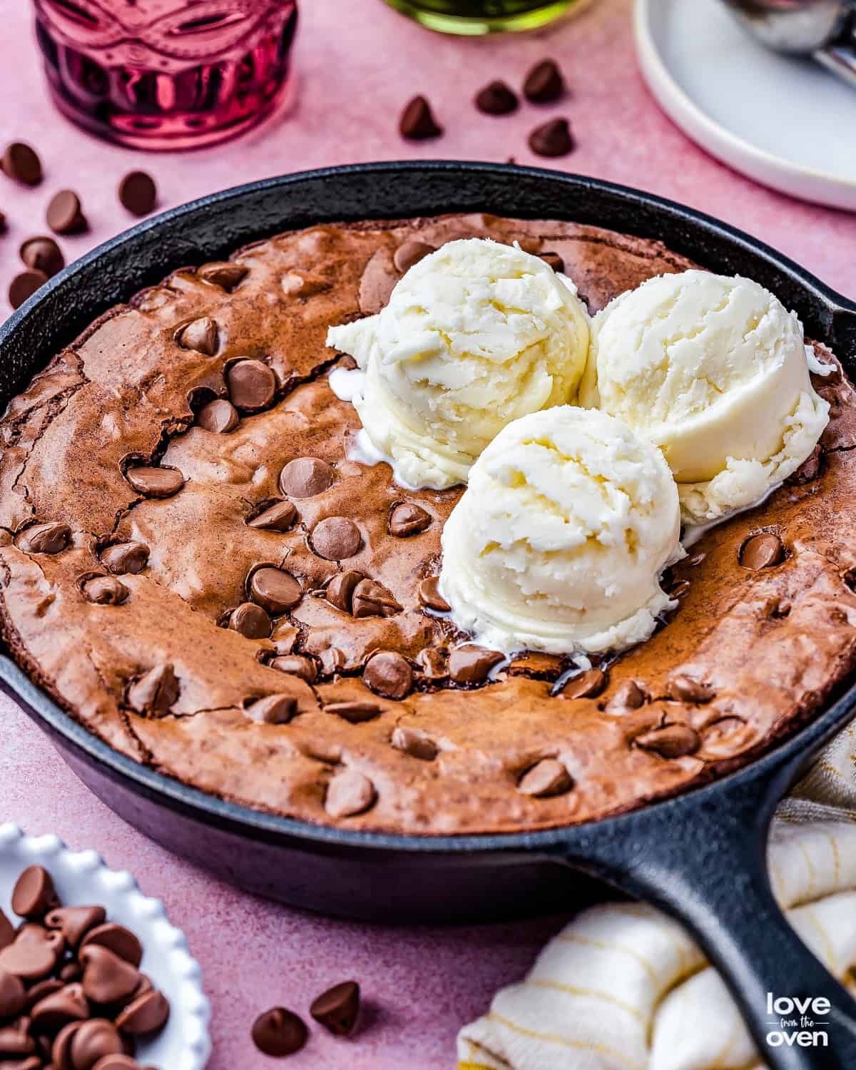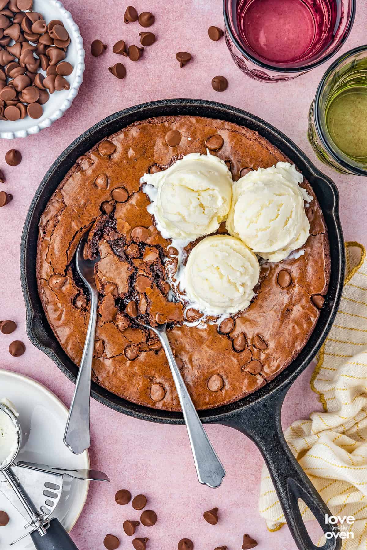 Storage – If you’re eating the brownie out of the pan, especially if you put ice-cream on top, I don’t recommend storing the leftovers. If you didn’t, scoop the brownie out of the cast iron and transfer it to an airtight container, then store at room temp. for about a week, or freeze for up to 3 months. Leaving the brownie in the cast iron could damage your pan.