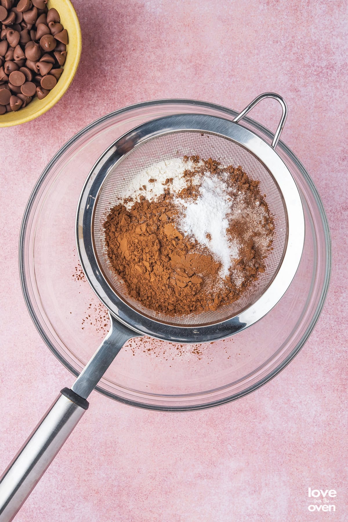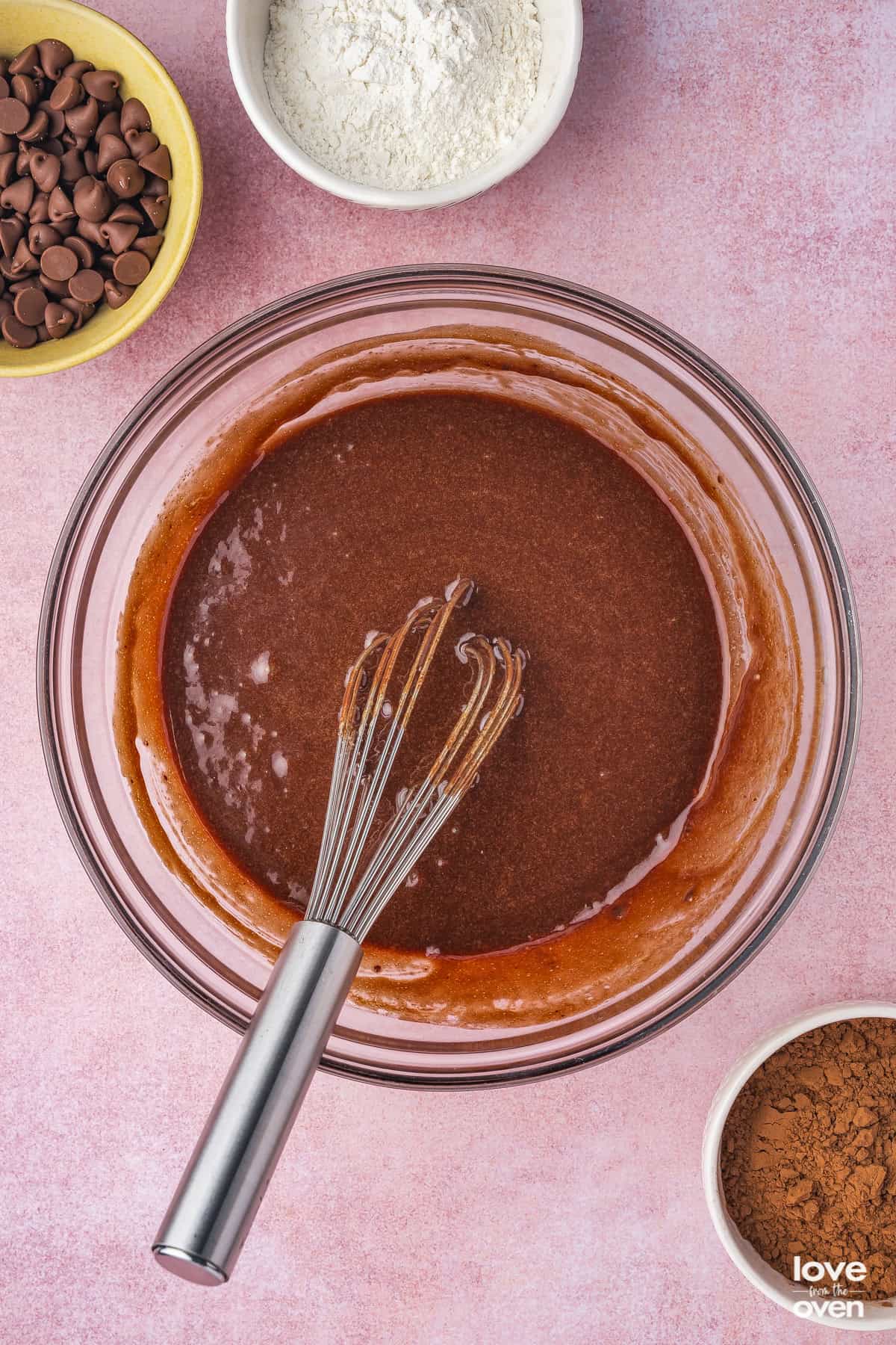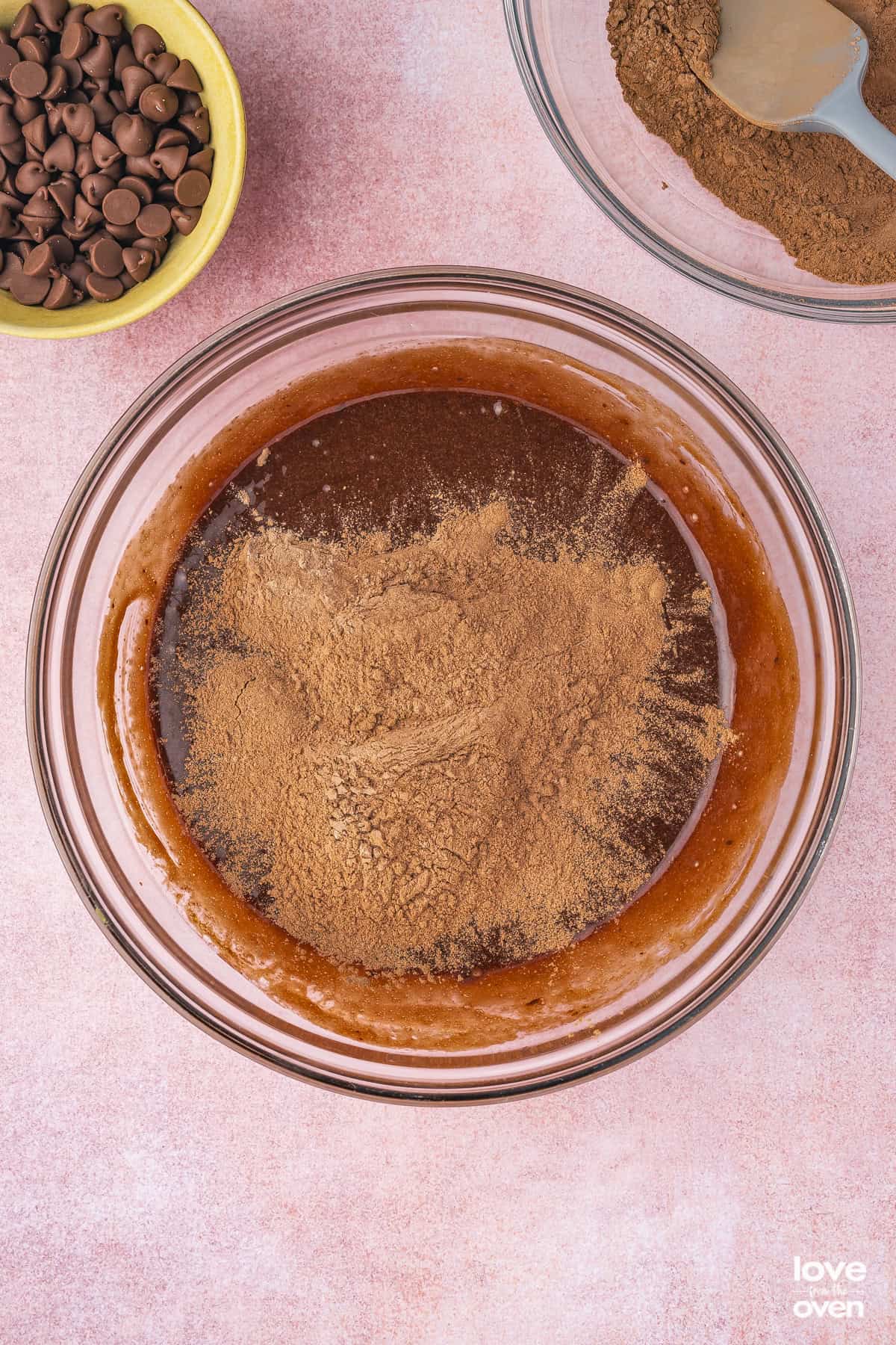 - In a separate mixing bowl, sift in the cocoa powder, flour, baking powder and salt. Whisk to combine.