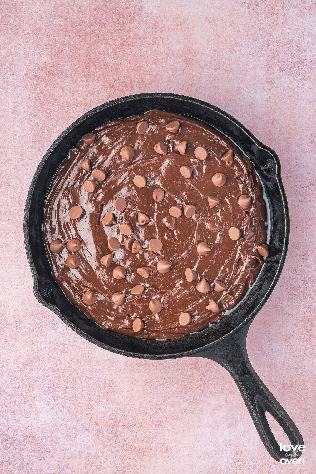 - Pour batter into skillet, sprinkle in chocolate chips, bake for 20-25 minutes until cooked through.