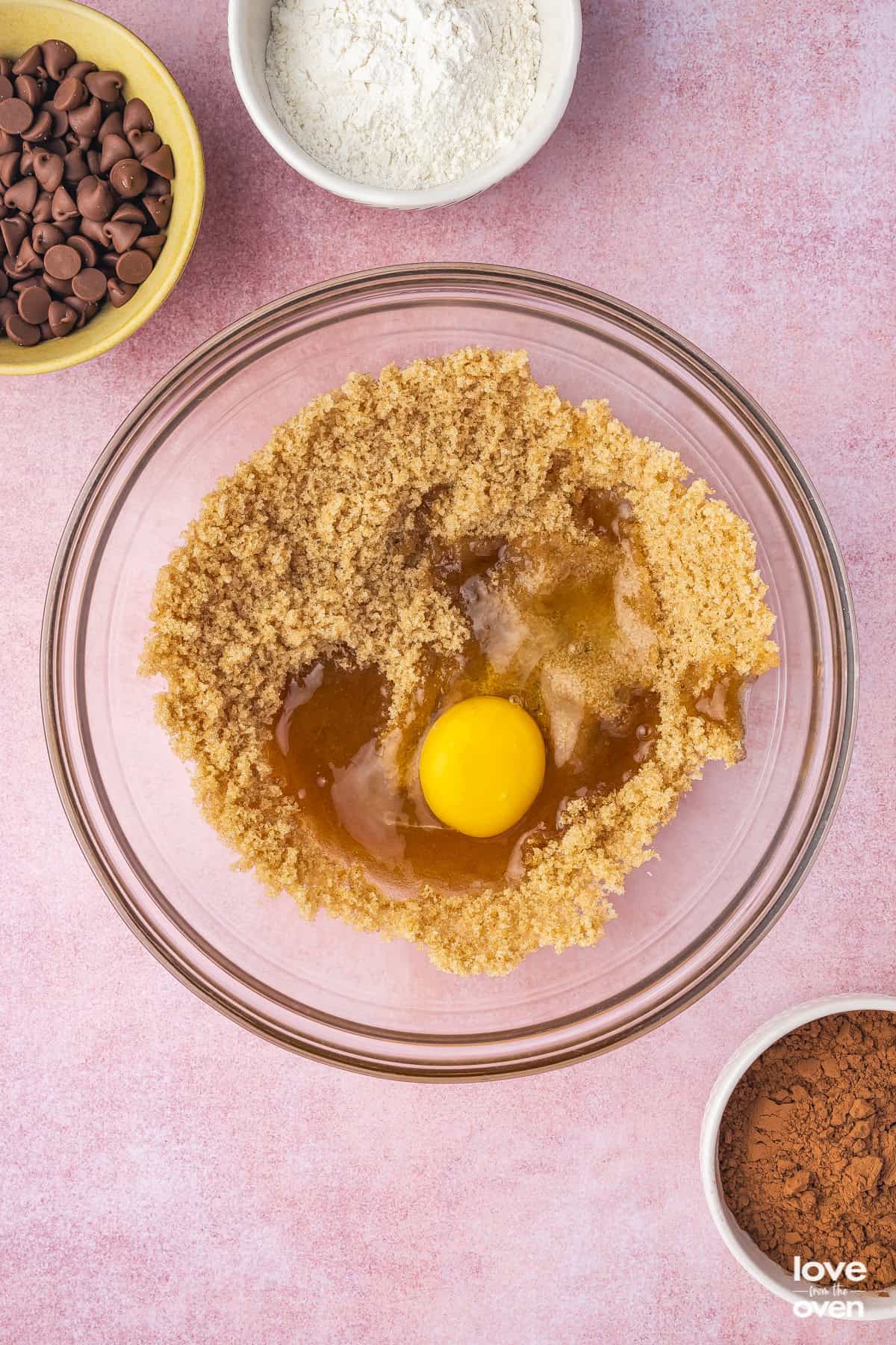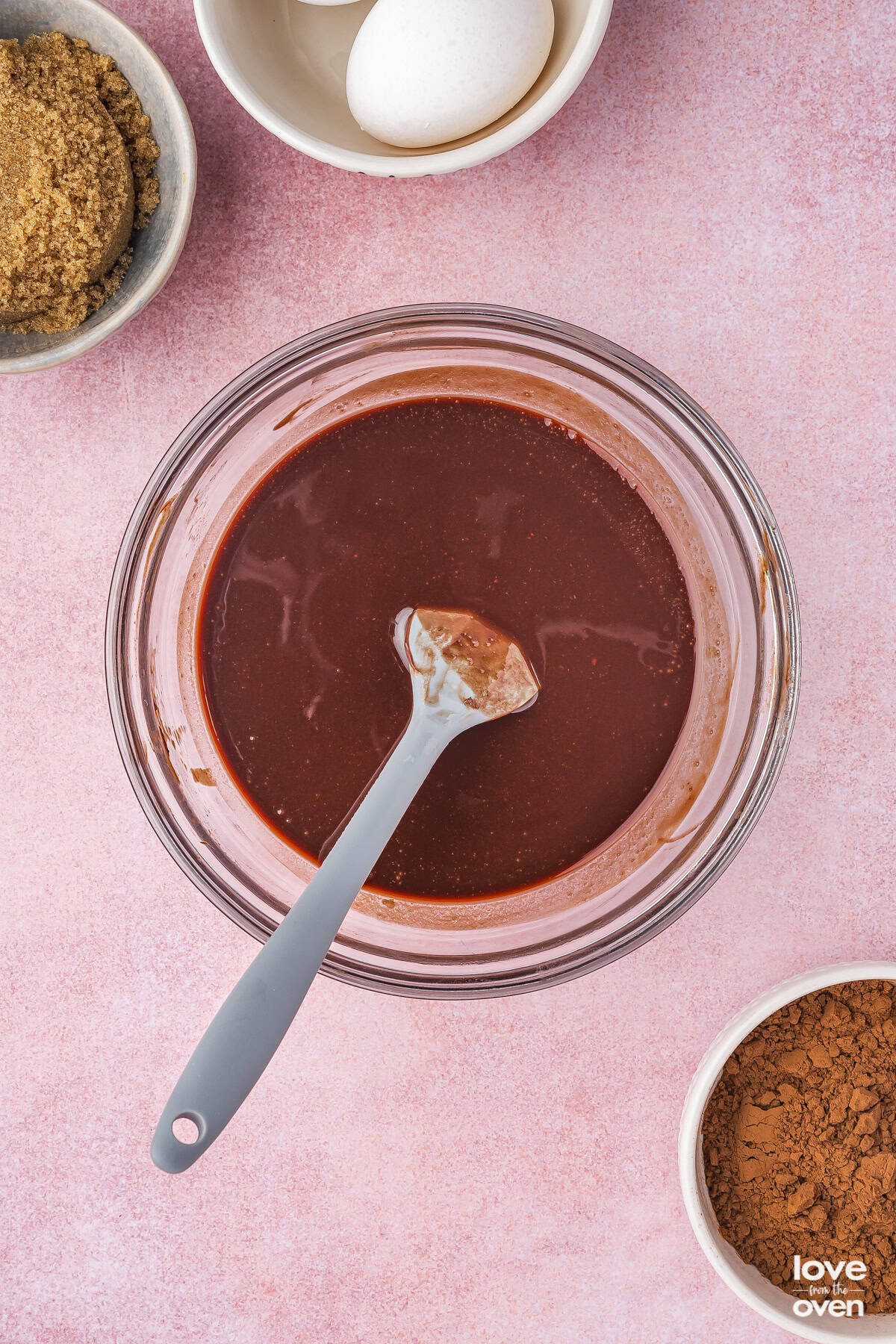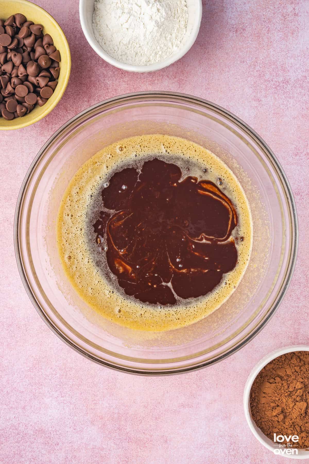 - Add sugars and vanilla to bowl and mix. Add eggs one at a time and mix. Pour in melted chocolate mixture and mix until fully combined.