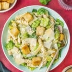 Storage - Store the leftover chicken cesar pasta salad in an airtight container in the fridge for 2-3 days. Personally, I don't enjoy the texture of dressed lettuce sitting in the fridge, so if I were making this with the intention of having leftovers, I would store the dressing, pasta, chicken and lettuce all separately then toss a serving when I'm ready to eat.