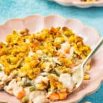 This popular comfort food dish has a creamy & savory chicken filling and topped with a crispy, flavorful stuffing topping.