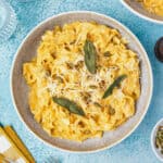 Add the cooked pasta to the sauce along with the pasta water. Toss until the noodles are evenly coated. Dish out your servings of pasta, and top each serving with some toasted pumpkin seeds, the roasted sage leaves, and more parmesan cheese if desired. Enjoy!
